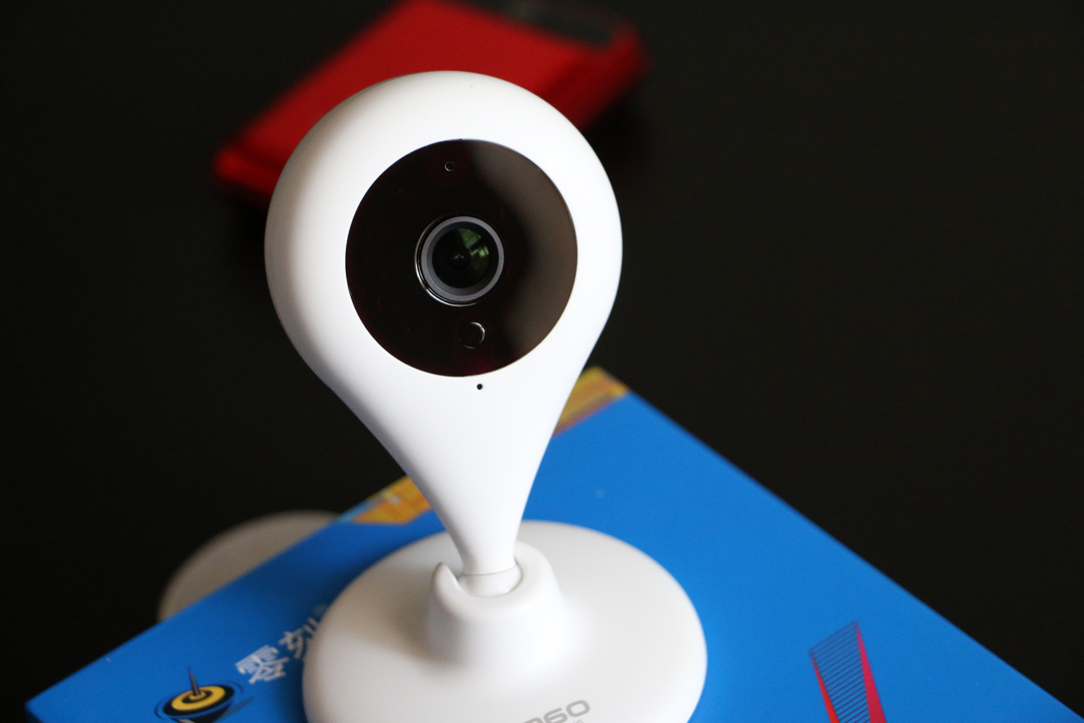 360智能摄像机夜视版的整机尺寸为105mm*58mm*68mm,裸机重量为102g,其外观造型有点像水滴,这也是其被大多数人称为"360小水滴"的原因。其外观采用ASB+PVC材料,可以看到摄像头附近带有一圈黑色的装饰板。摄像头上方带有一个LED指示灯,其红外灯采用隐藏设计,从外面看不到。