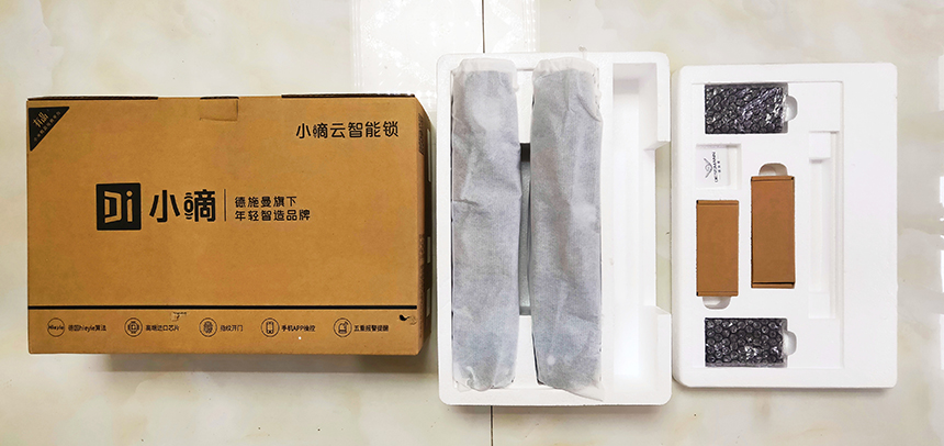 掀开包装盒能看到满箱的塑料泡沫,对于产品包装及运输过程中的保护措施应当不留余力:第一层泡沫容纳的是电池、锁体、螺钉等配件,下层的泡沫中严严实实地包裹锁具的内、外面板。