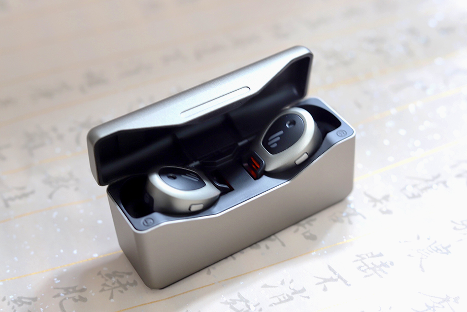 再来说一说充电舱,整体外形给人以机甲的感觉,金属质感很强,非常的炫酷,把玩时也不会轻易的留下指纹汗渍等;体积大小也控制的很好,基本上一只手就能够掌握;同时,机舱配备的是Type-C,位于机身右下角,一侧还设置有电量指示灯,可实时显示剩余电量。舱内的充电位呈一字左右排开,简约且又不失美感。