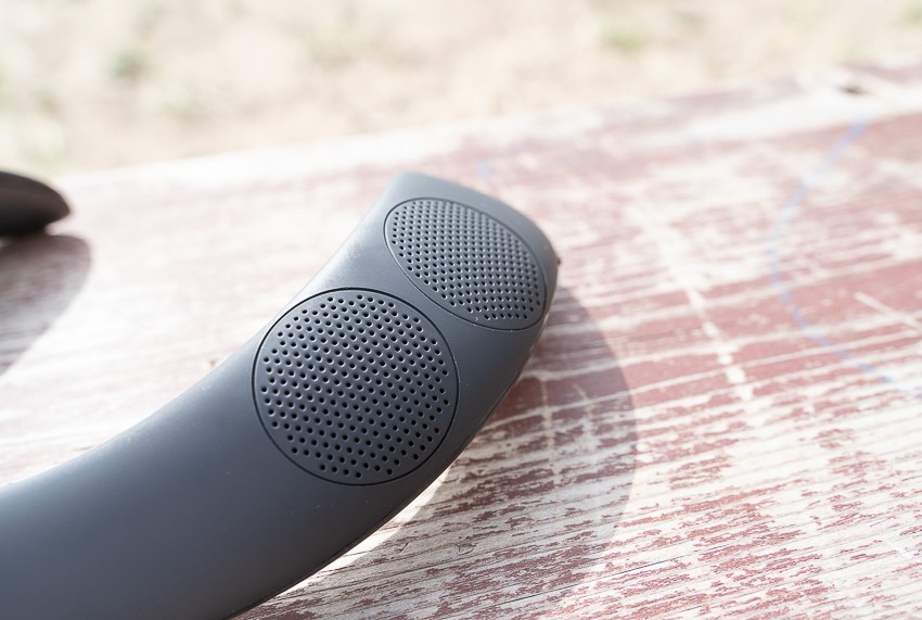 HS颈挂式音箱比我想像中要稍微大一些,左右宽度为232mm,上下高度为176mm,整体为半圆形形状,外观均为黑色,音箱正面采用的是磨砂亲肤材质,摸起来很舒适,但稍微会留下手印。