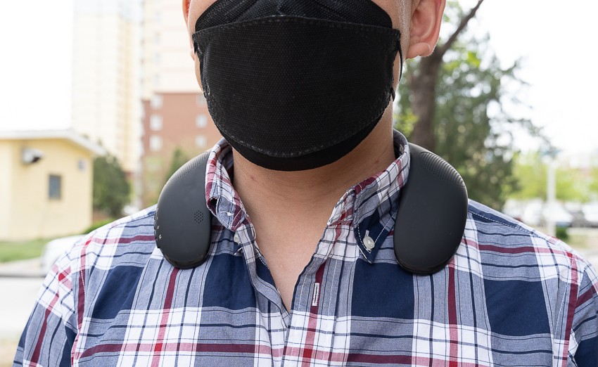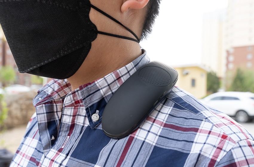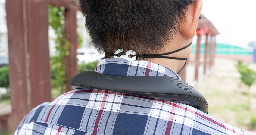 佩戴方面,产品很轻,符合人体颈肩曲线设计,放在颈部毫无佩戴感,可以释放双手。