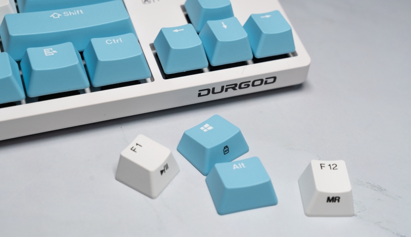 键盘颜色由蓝白两色互相搭配,为突出其功能按键,键盘两侧的功能按键和部分功能FN功能设置为蓝色,方便操作。