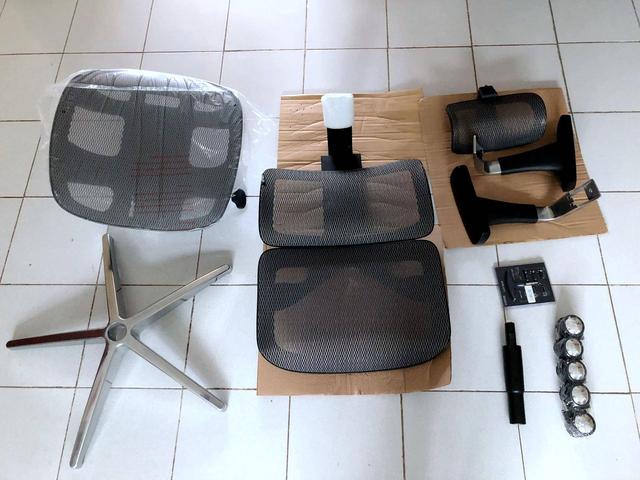 左起开始分别是:坐垫,五星脚,椅背,头枕,扶手一对,安装工具,气杆,滑轮。