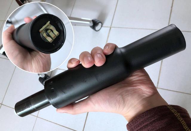 黑色的气杆,粗的一头向下差入五星脚,细的一头插入椅背的接口。