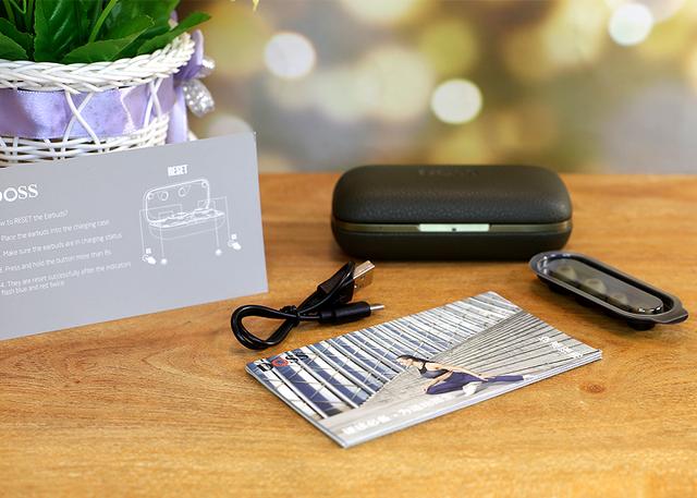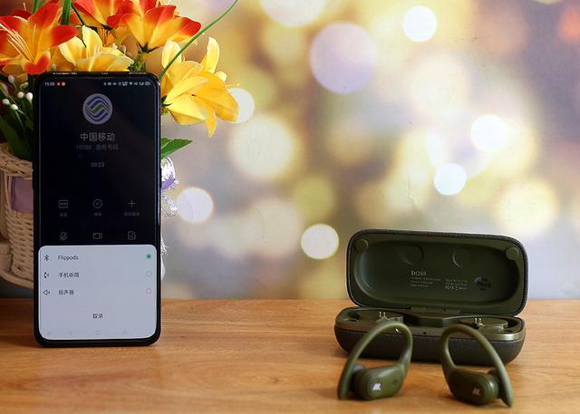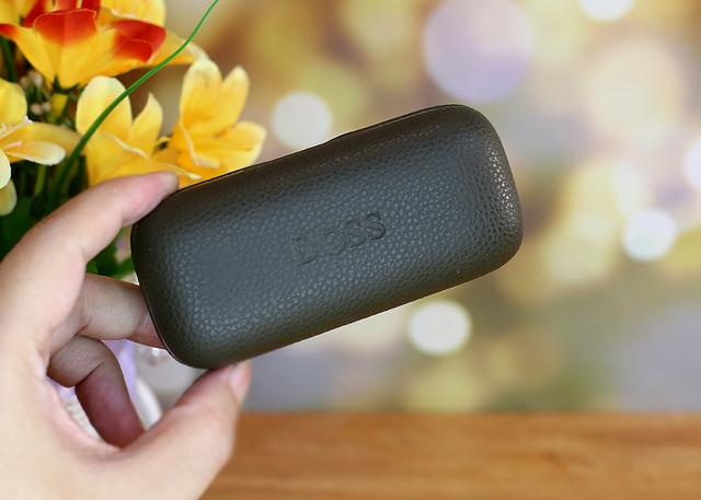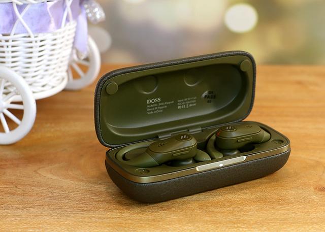 充电盒尺寸可不算小,整个表面为聚氨酯皮革材质,整体设计颇为个性化。正面带有DOSS品牌标示,细密的纹理显得别出心裁给人以时尚轻奢的第一印象。耳机的色彩上有好几款颜色可选,优雅黑、银光白、海军蓝和丛林绿充电仓的配色也更具耳机色彩不同而有所区别。