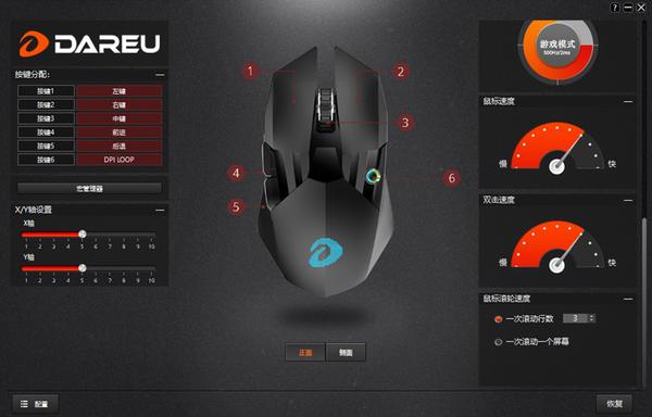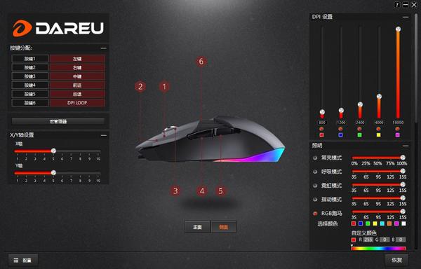 达尔优A970游戏鼠标也使用了单独的驱动,项目分类还比较清晰,容易上手。6个可编程按键,支持宏编程。支持储存5个常用DPI档位,鼠标双区RGB动态灯效有比如霓虹模式、RGB跑马灯模式、指动模式,1680W色指示灯也可以自定义。
