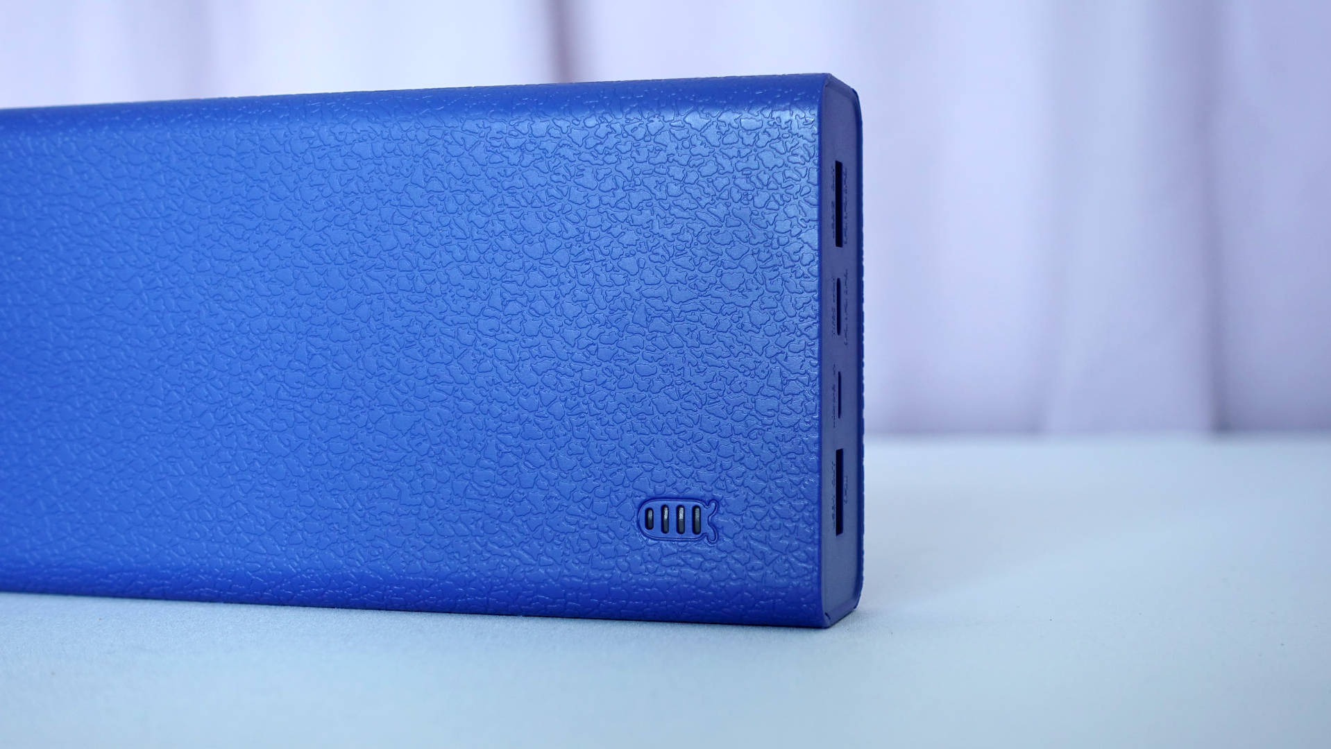 从刚刚包装盒上的渲染图可以看到这款充电宝一共有两个配色,没错,这次我拿到的便是典雅蓝版本,在售的还有一款象牙白,个人感觉象牙白有些不耐脏。充电宝整体采用了皮革纹理工艺处理,材质为具有防火阻燃性能的ABS+PC。