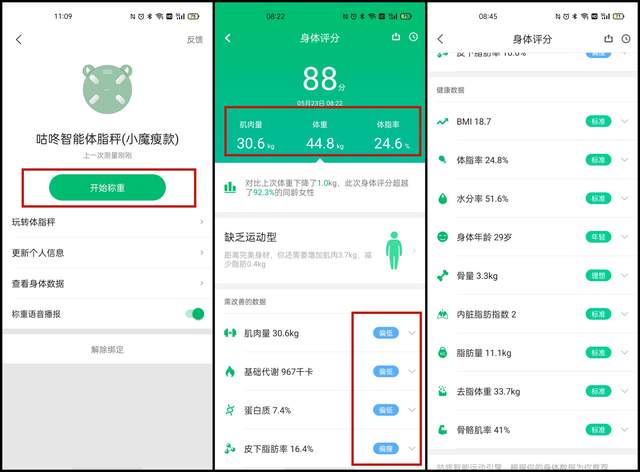 在语音播报体重时,咕咚手机APP会同步更新最新的体重数据,并且还会与上一次的测量结果进行对比,让你可以第一时间就可以了解最近体重变化。当然,同时还会根据你的个人身高、体重来分析你的肌肉量和体脂率,并且会给出相应的需要改善的数据以及健康数据。从而可以让我们可以根据数据情况进行相应的减脂、增肌训练。