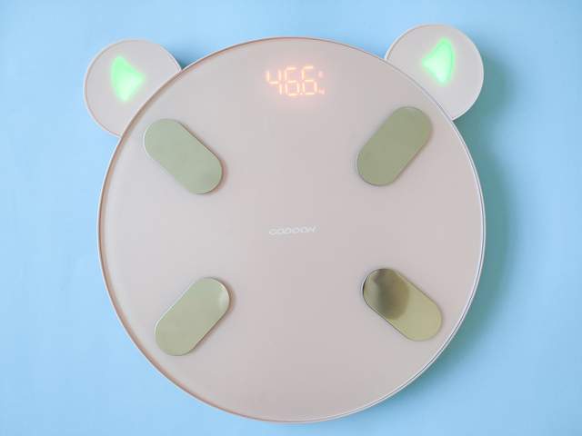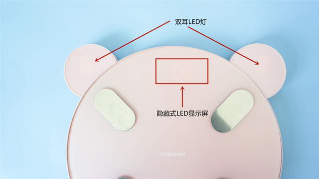 小魔瘦体脂秤的设计亮点还体现在其双耳LED灯,上称即可唤醒“小魔瘦”,当测量结果未锁定的时候,双耳会闪烁绿灯;当测量结果锁定时,绿灯则会常亮;此外双耳LED灯还可以提示电量剩余情况,当电量不足10%时,双耳闪烁橘灯。并且采用了隐藏式LED显示屏,从而使得显示屏与称面浑然一体,息屏时它就是一款萌宠般的家居装;上称时LED屏幕就会亮起,即使是强光也依旧可以清晰读数。