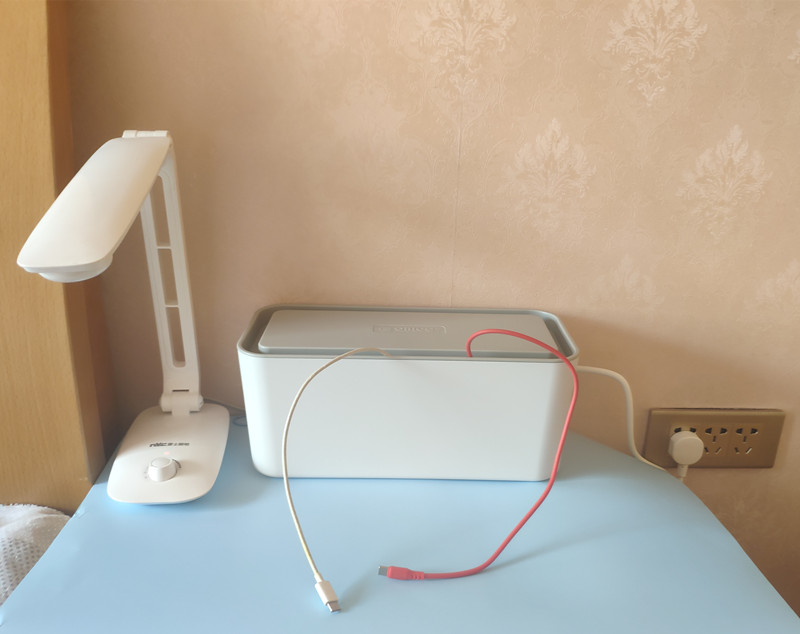 由于线可以从后面出来,使得收纳盒正面看起来整体看起来很整洁,告别了传统插线板长期使用的脏、乱、缠弊病,把剪不断、理还乱的线整理好,心情看着也舒爽不少。