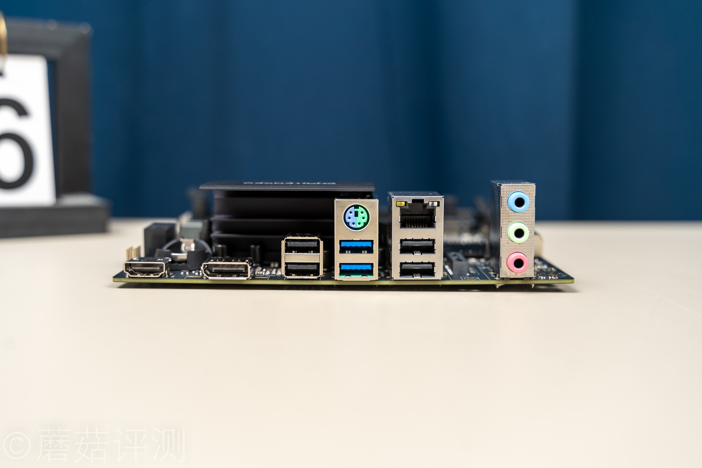 ▼主板的IO接口部分,USB接口六个,两个USB2.0,视频输出接口两个,一个DP、一个HDMI,音频接口三个。