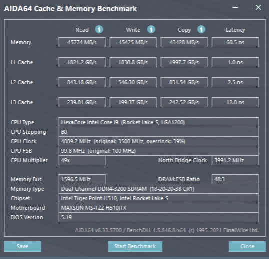 ▼简单跑个测试,内存的读写速度都能去到45000MB/s左右,延迟60.5ns,整体不错。