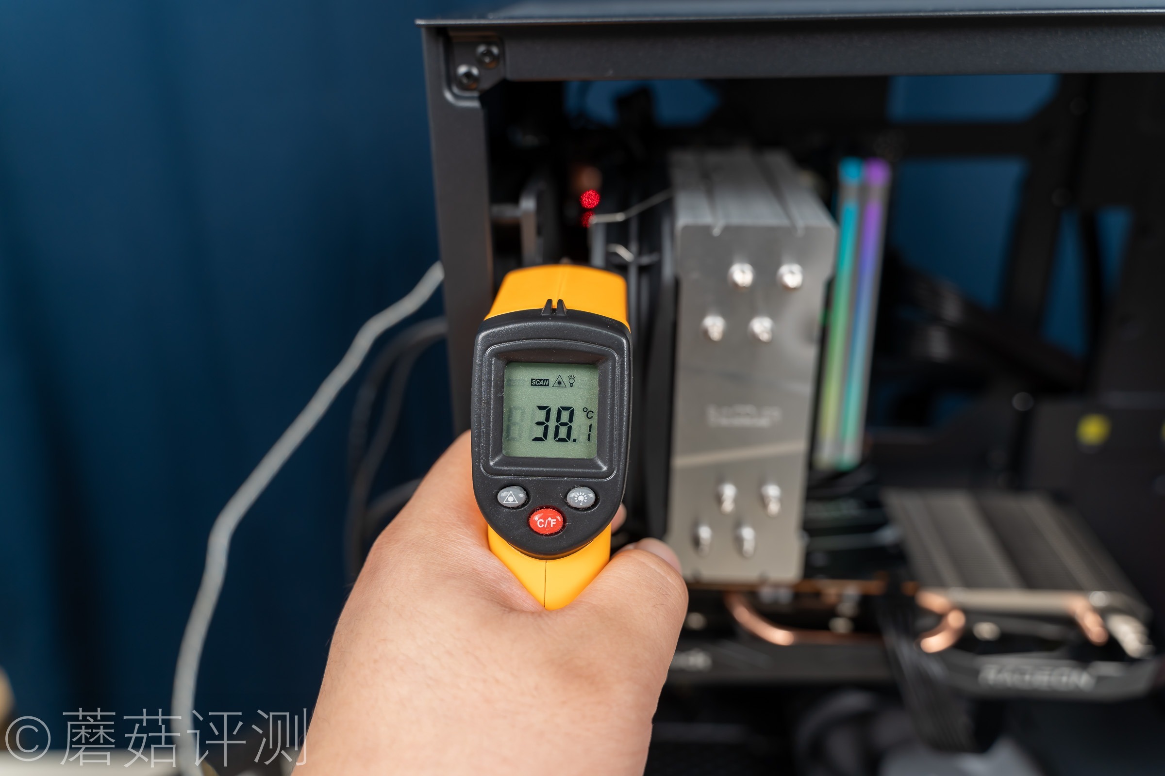 ▼用温枪打一下散热片顶部的温度,仅有38.1℃,和散热片底部有一定的温差。