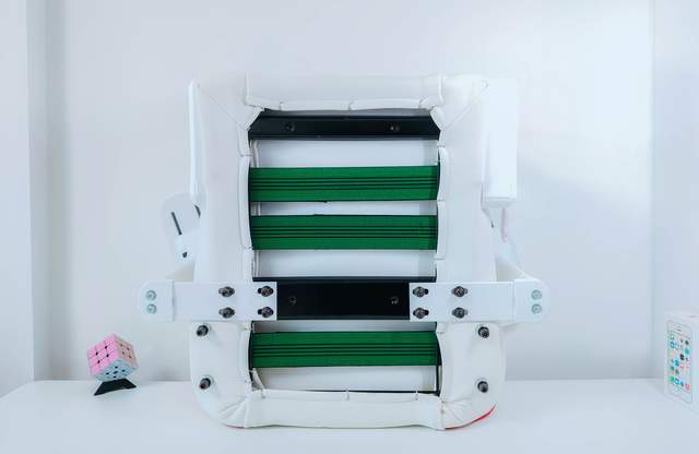 靠背两侧各有两颗螺丝孔,通过螺丝与坐垫相连。为了整体美观,底座和靠垫固定后还增加了白色的装饰板。