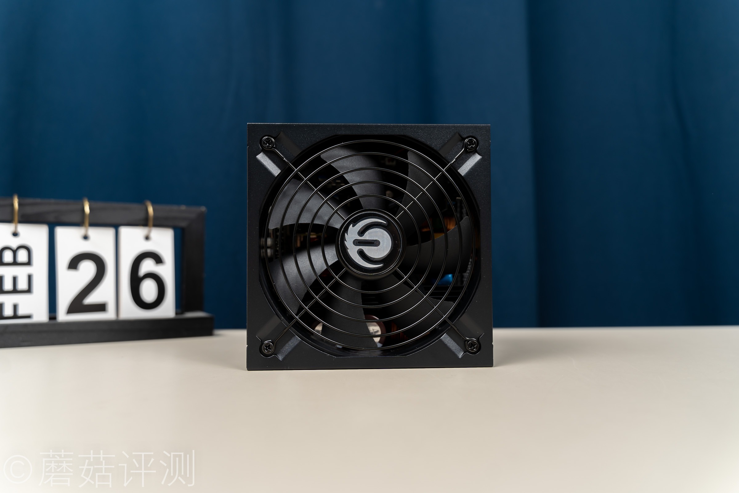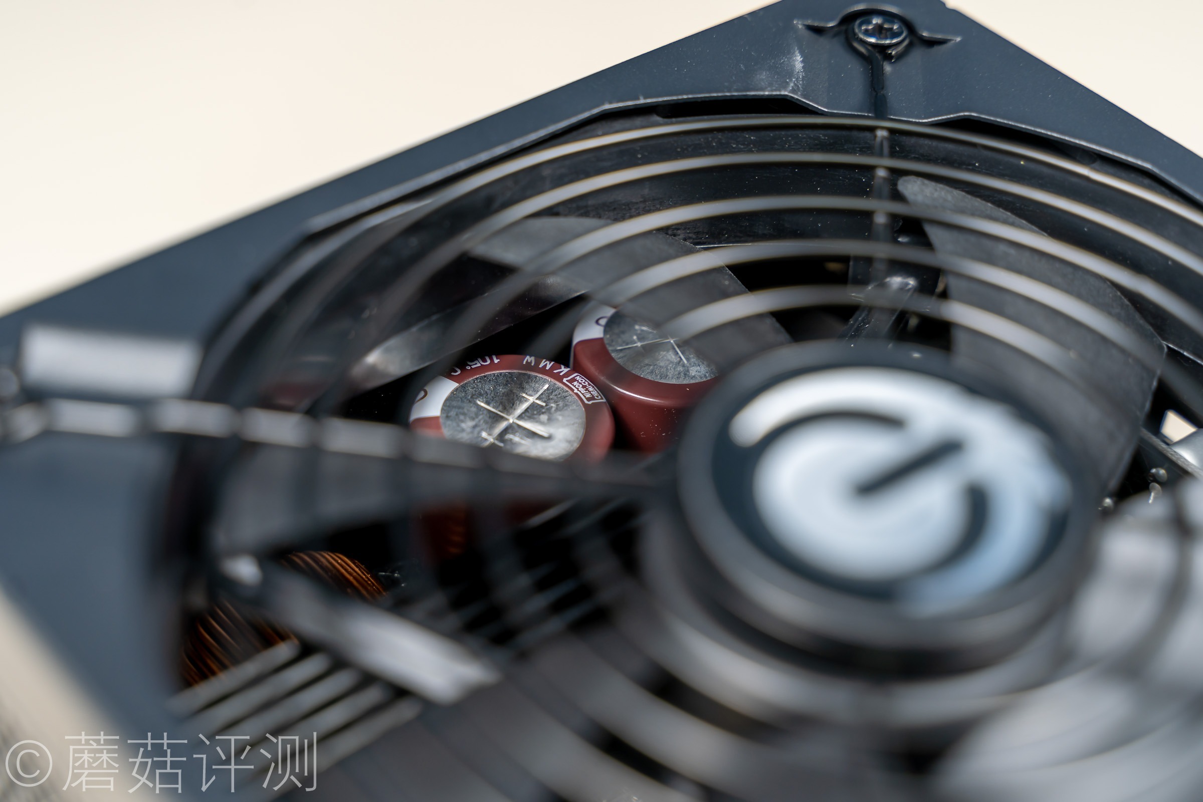 ▼电源的背面有一个硕大的散热风扇,尺寸非常大,有140mm。这个风扇的“屏占比”超级大,一眼看过去全是风扇。