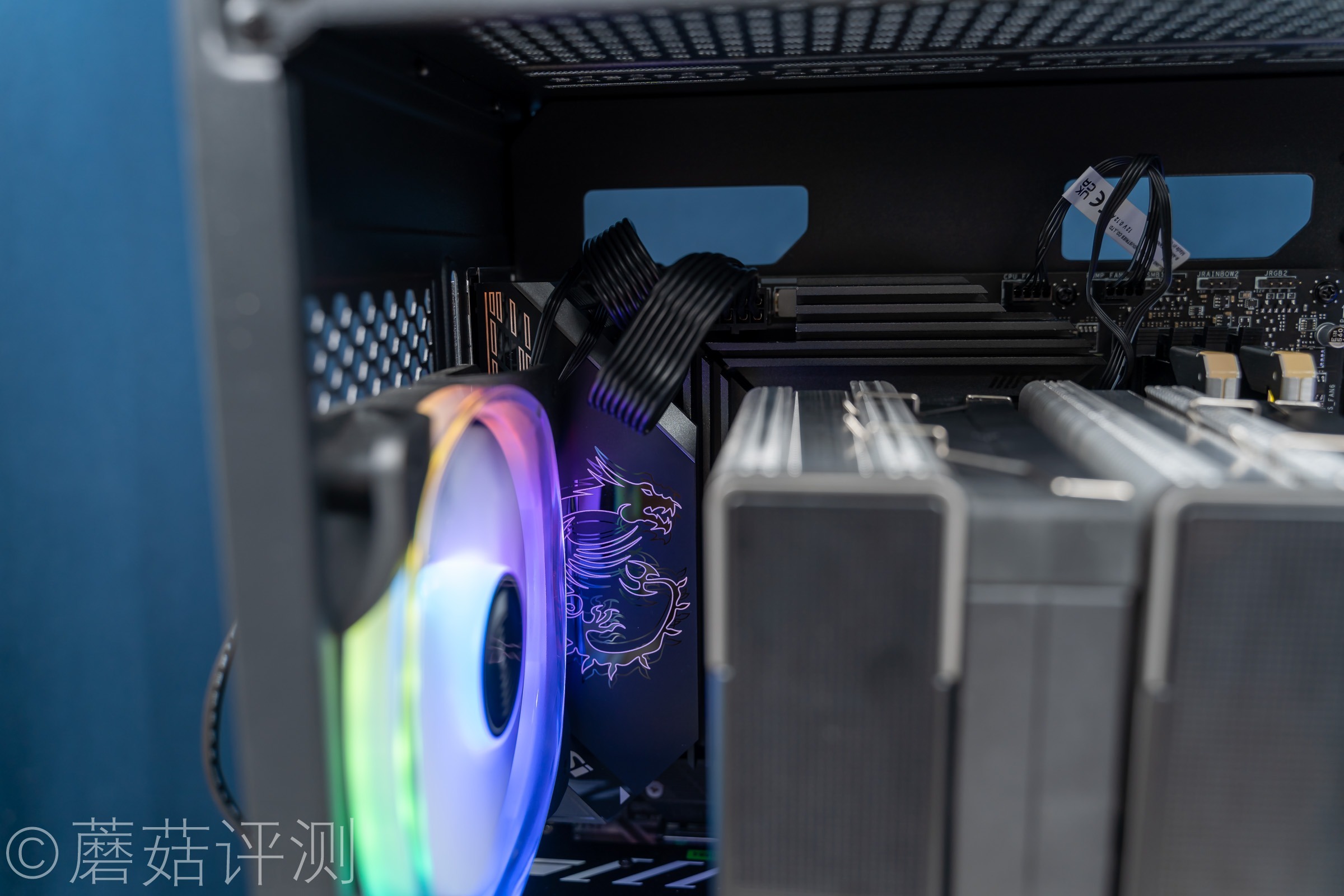 ▼主板是微星的Z590刀锋Wifi主板,其IO饰罩上有微星熟悉的龙盾LOGO,且支持幻彩ARGB灯效,非常不错。