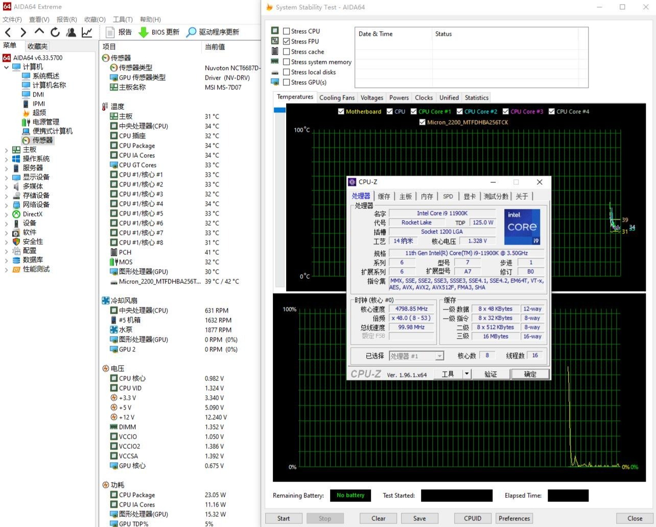 ▼日常待机的情况,处理器功耗在23W左右,温度34℃。