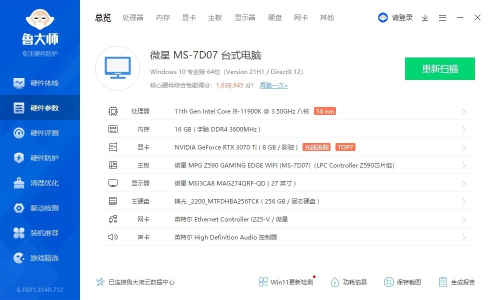 ▼先打开鲁大师,看一下整机配置。处理器是11900K,主板是微星的Z590刀锋Wifi,内存是扎达克的SPARK,显卡是影驰的RTX3070Ti星耀OC。