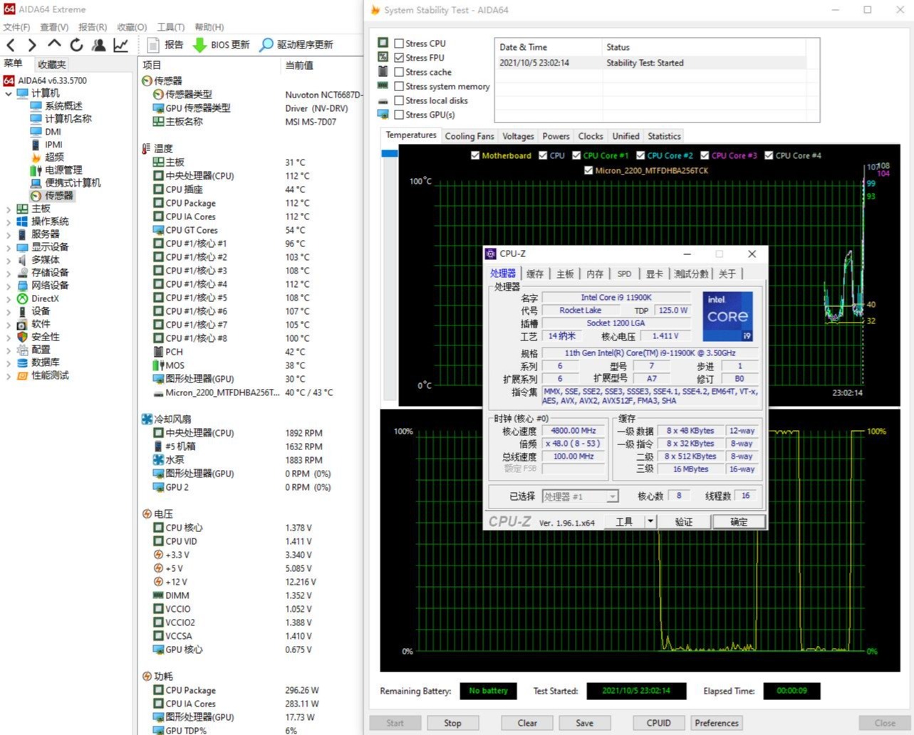 ▼单烤FPU的情况下,处理器的功耗在300W左右,处理器温度直接飙升到了112℃,面对全开的AVX512,散热是肯定撑不住的。
