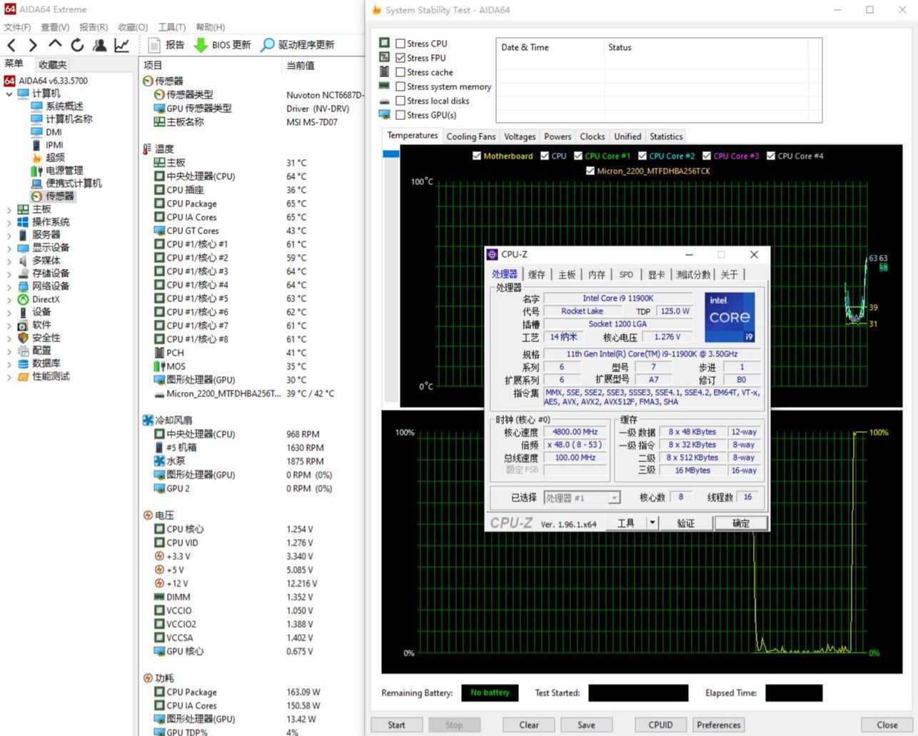 ▼简单跑一下CPU-Z的压力测试,处理器功耗163W,温度64℃。