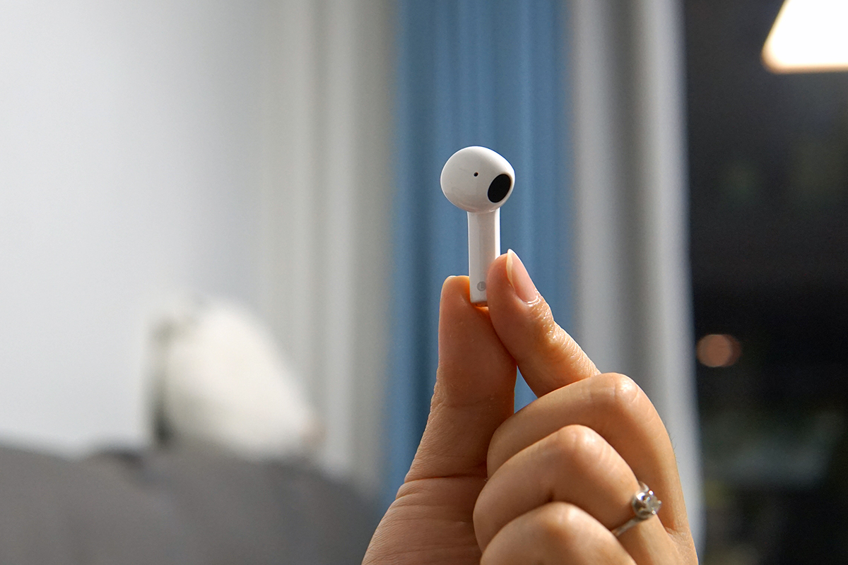 耳机拖着一条小尾巴,从这个角度看是不是有点airpods的味道?哈哈,我愿意称绿联小海豚耳机是airpods的百元平替。耳机采用半入耳式的佩戴方式,相较于入耳式、挂耳式的佩戴方式,半入耳才是最舒适的。耳机佩戴后,比较贴合耳部轮廓,并且不会挤压耳道,有助于减轻长时间佩戴下,耳部的疲劳感。