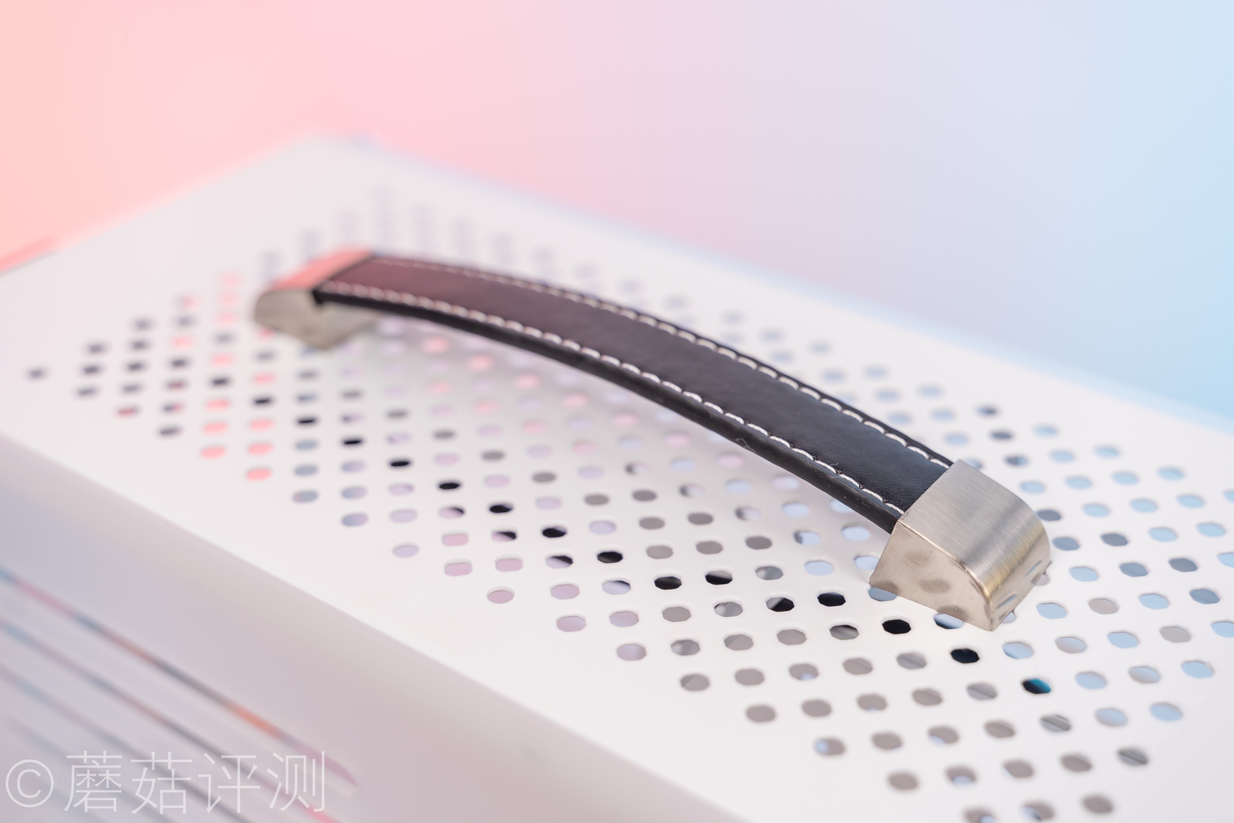 另外,机箱两侧的亚克力材质默认是透明的,格栅默认是横向的。如果有需求的小伙伴,可以轻松定制一些其他颜色、造型的亚克力,直接更换,也很简单。机箱上面的提手设计的很棒,日常移动机箱超级方便,好评。