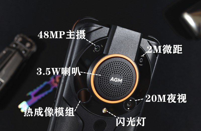 ▲再来看背部,整体线条和设计非常工业风,充满了肌肉感,背部的防撞防摔模块化设计非常多,腰部头部底部均有加厚模块,亲测也是非常耐操的。中心位置就是一颗指纹解锁识别点,最美的地方就是顶部的摄像头区域,这次AGM G1 Pro增加了我玩过手机中前所未有的功能,那就是夜视、热成像、测距三个功能,然后就是4800万像素imx582主摄、及2M微距摄像头,这个摄像区域的设计真的是前所未有,起码别的手机我是没接触过热成像和夜视功能。