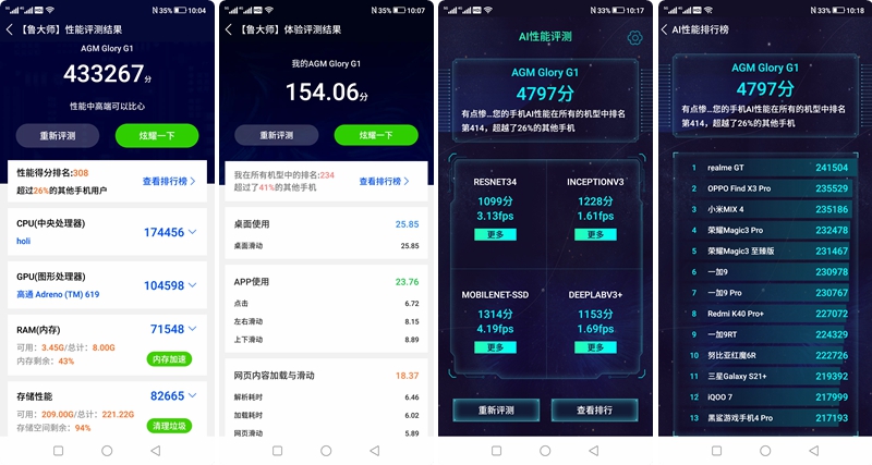 ▲AGM G1 Pro搭载的是骁龙480的处理器,也是骁龙高通最新发布的入门款5G芯片,虽然是4开头的系列,但是性能绝对不是按数字来定义的,我就说不按常理出牌吧。骁龙 480 的A76主频为2.0GHz,内核A55 的主频可达 1.8GHz,也就是说核心架构为大核A76 2×2.0GHz+小核A55 6×1.8GHz的组合,小核的频率会比大核更高,GPU为高通 Adreno 619,100%超越了前代。鲁大师跑分为433267分,排名308,安兔兔340158分,超越9%的用户,跑分过程中机身温度极低,感觉不到发热,整体操控性能上已经是非常不错的表现。