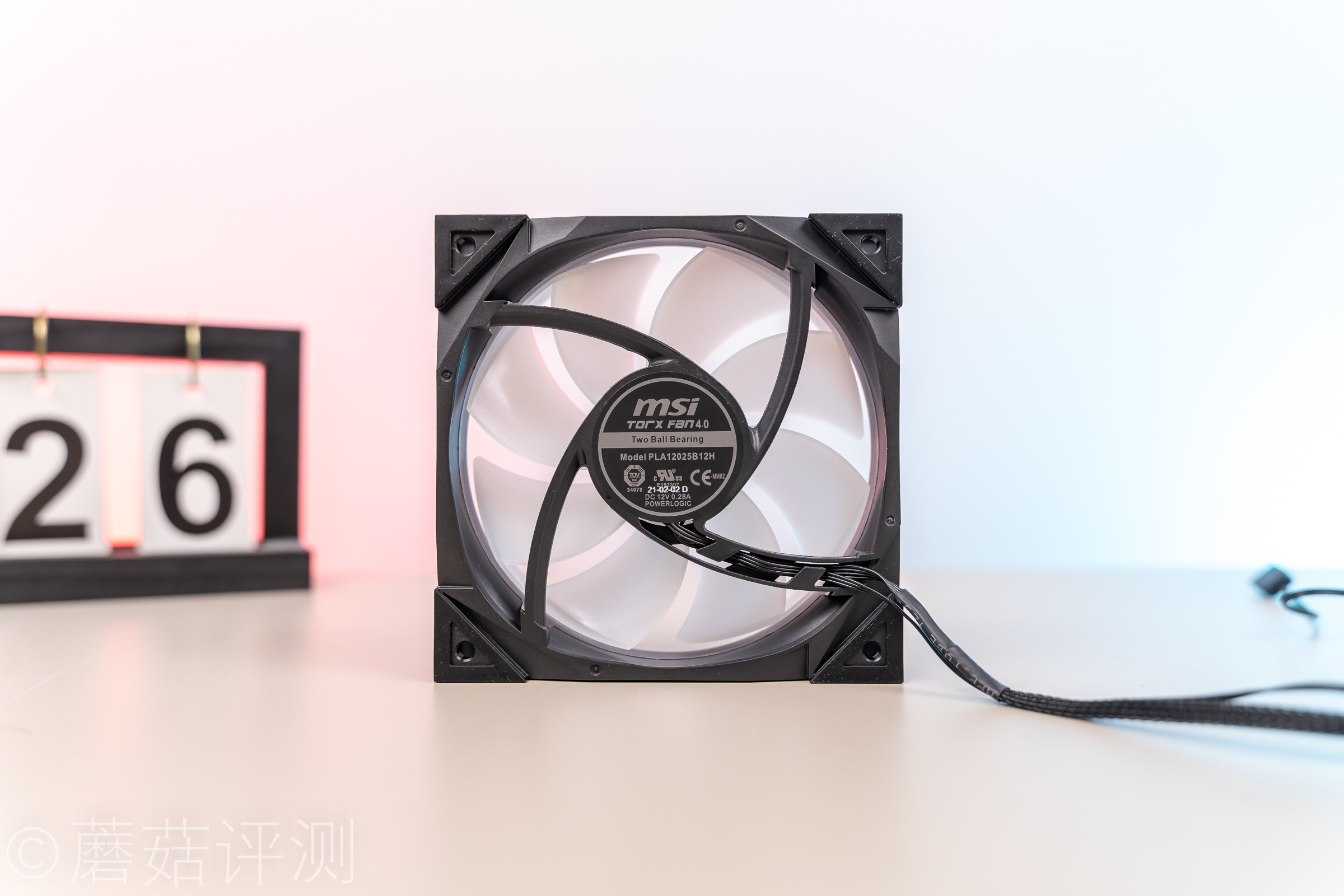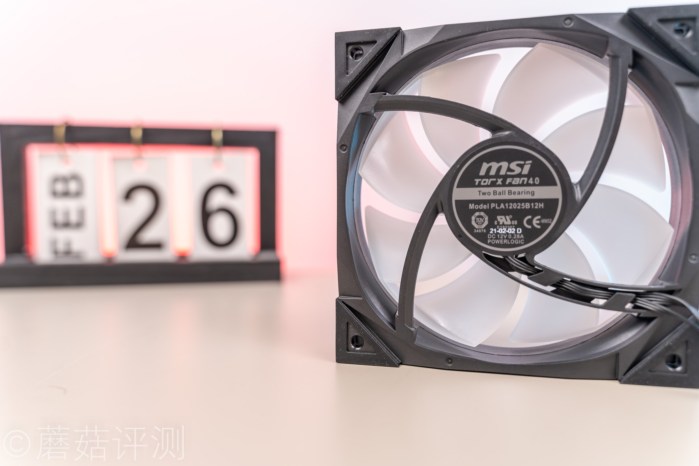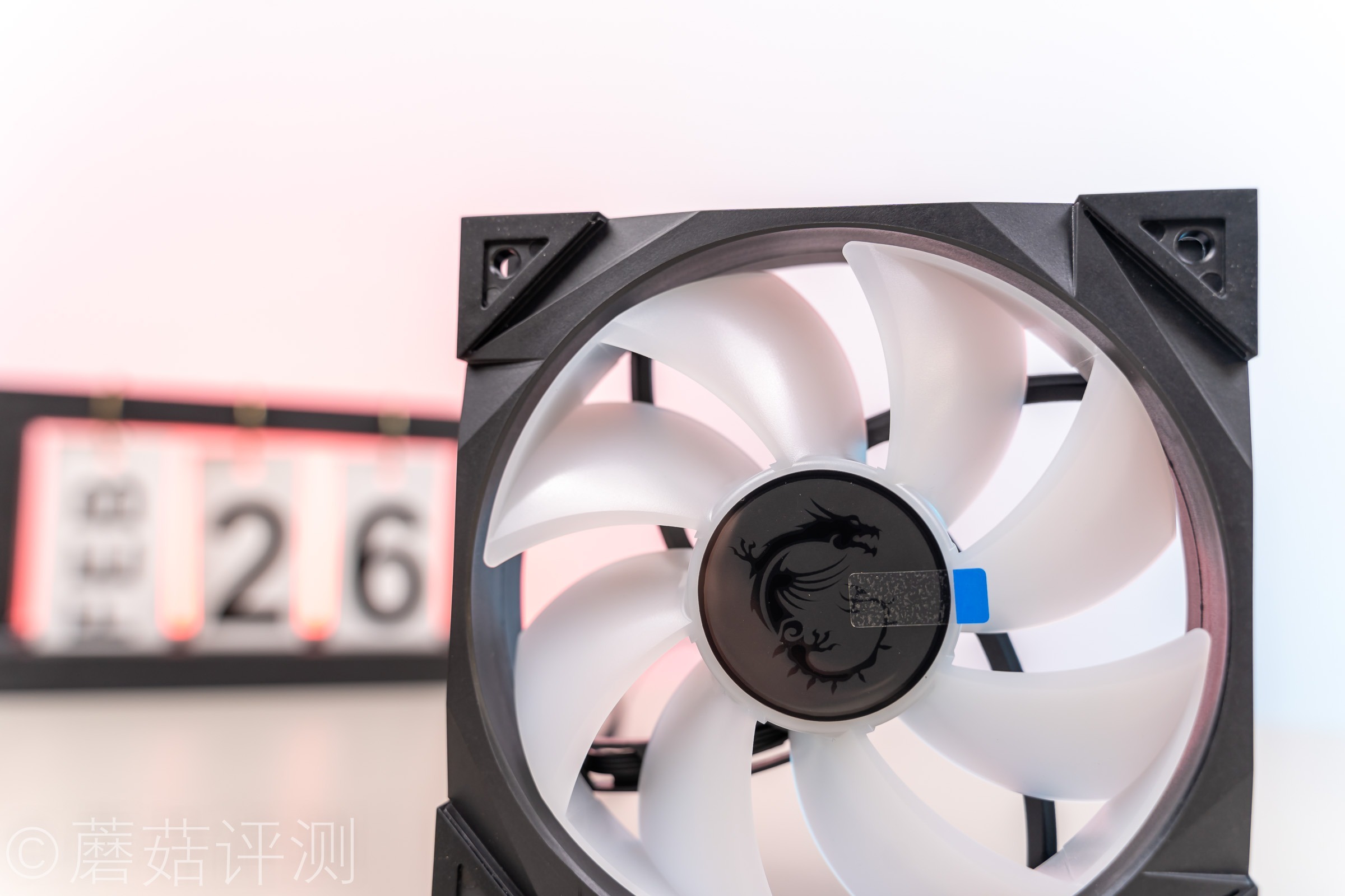 ▼这款水冷的冷排风扇也是特殊设计的,外面的框架是黑色的,风扇的扇叶是乳白色的,扇叶中间还有微星经典的魔龙LOGO,看着很漂亮。
