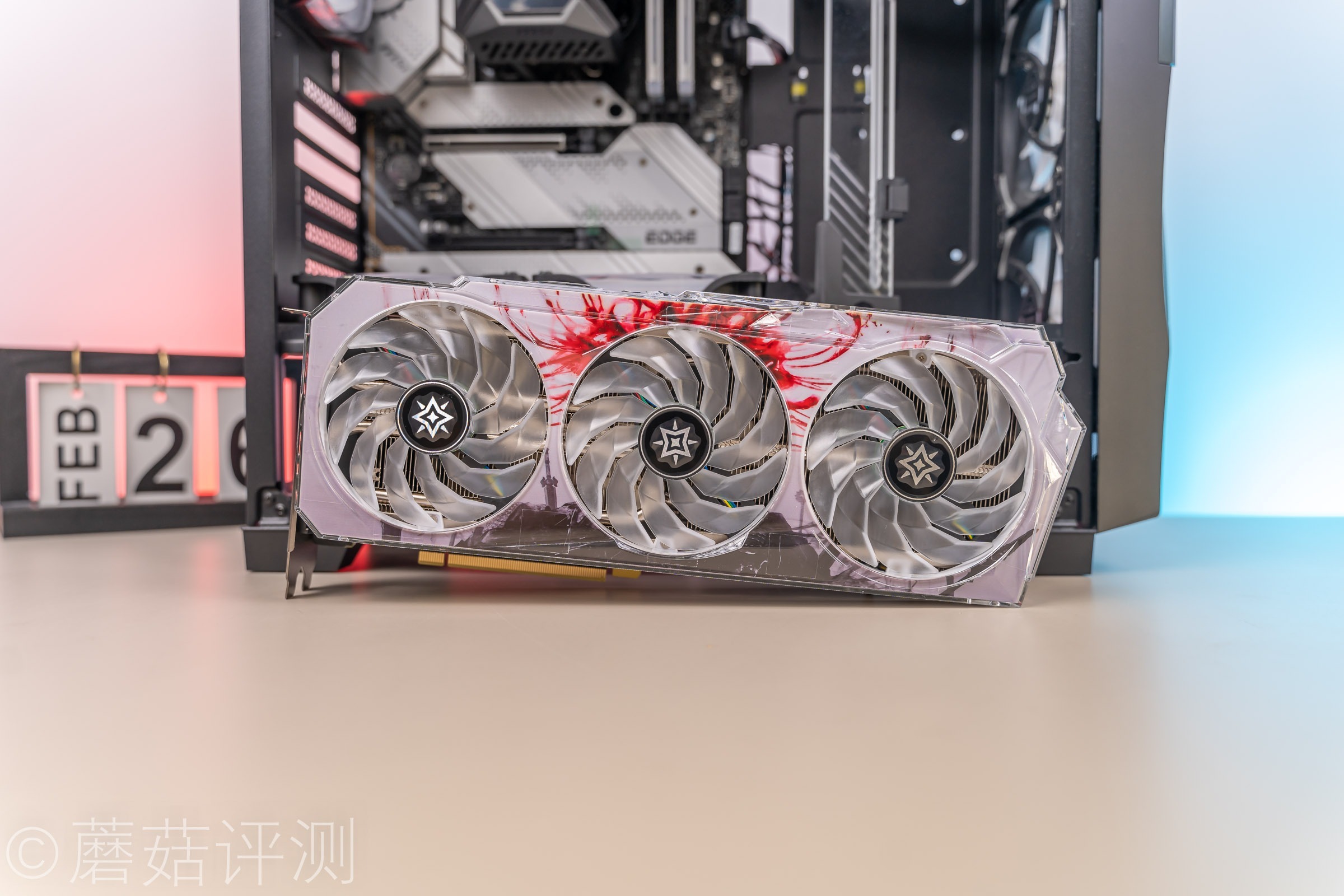 ▼显卡的灯效非常漂亮,风扇有RGB灯效,风扇罩上的透明表面会反射漂亮的光线。