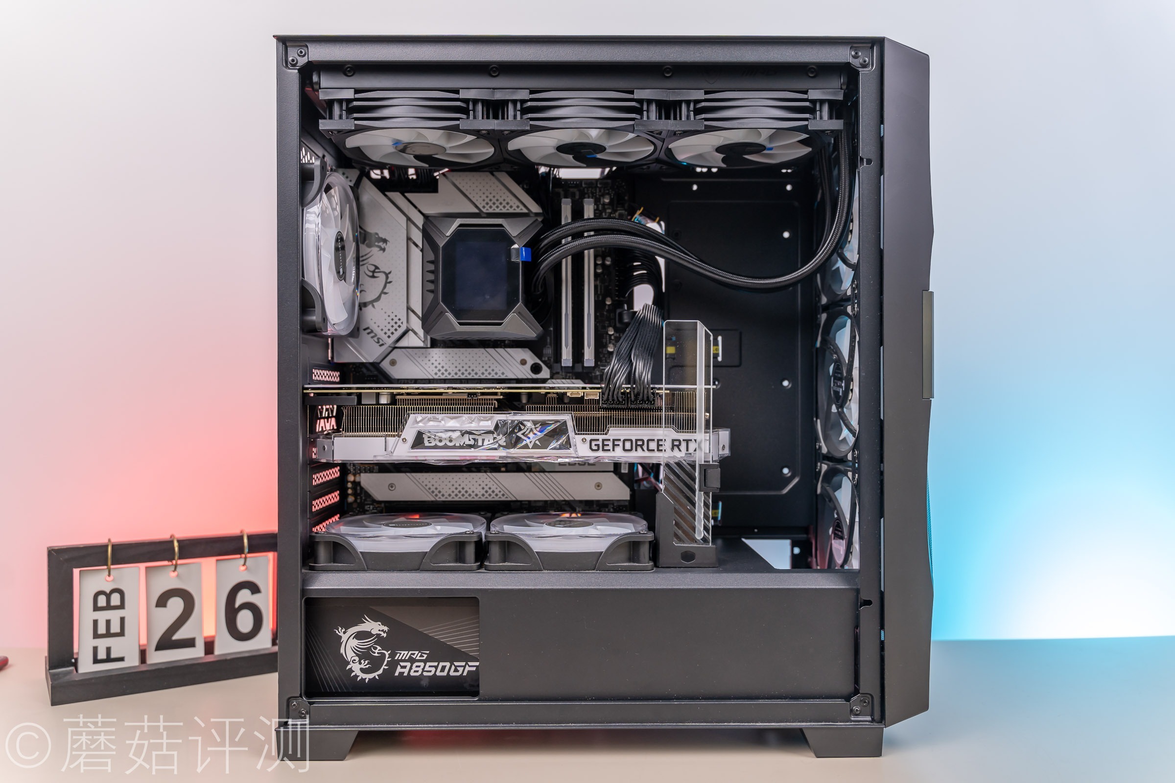 ▼电源是微星的MPG A850GF金牌全模组电源,这款电源的颜值很漂亮,侧面有微星漂亮的魔龙LOGO。另外这款电源拥有全日系电容,10年质保,日常使用还是非常放心的。