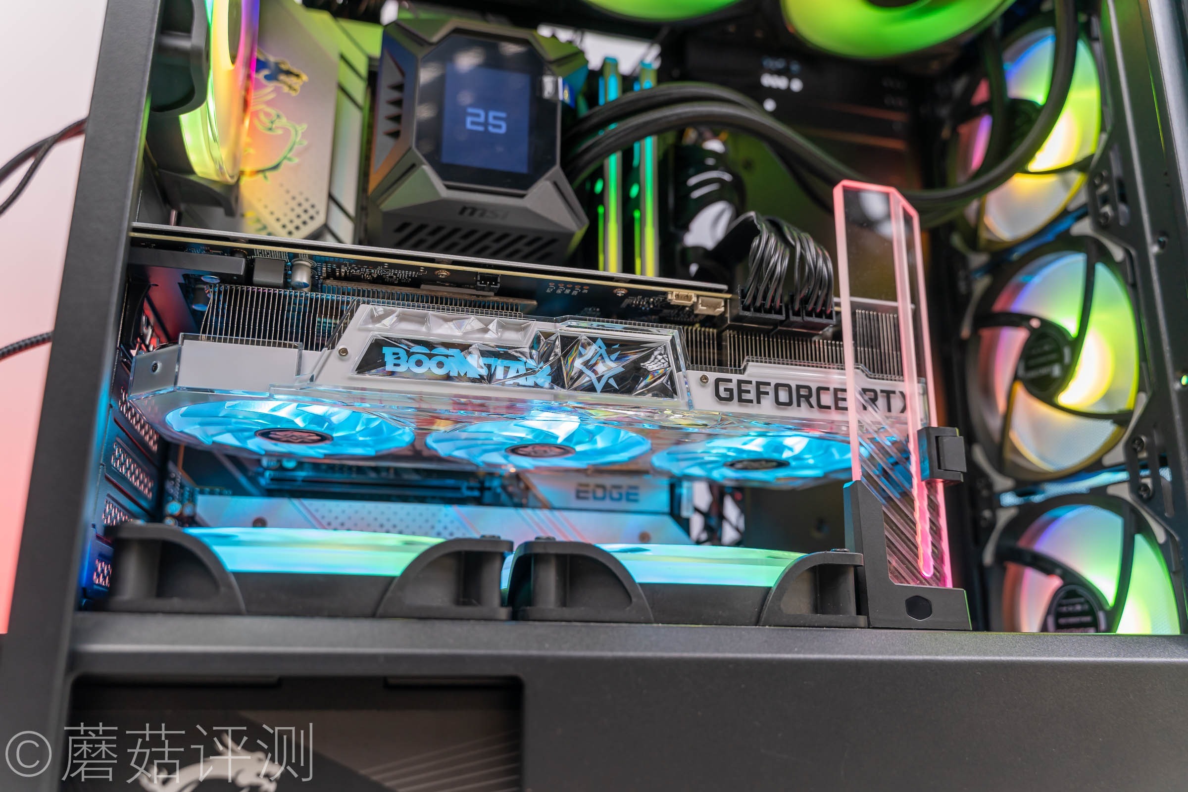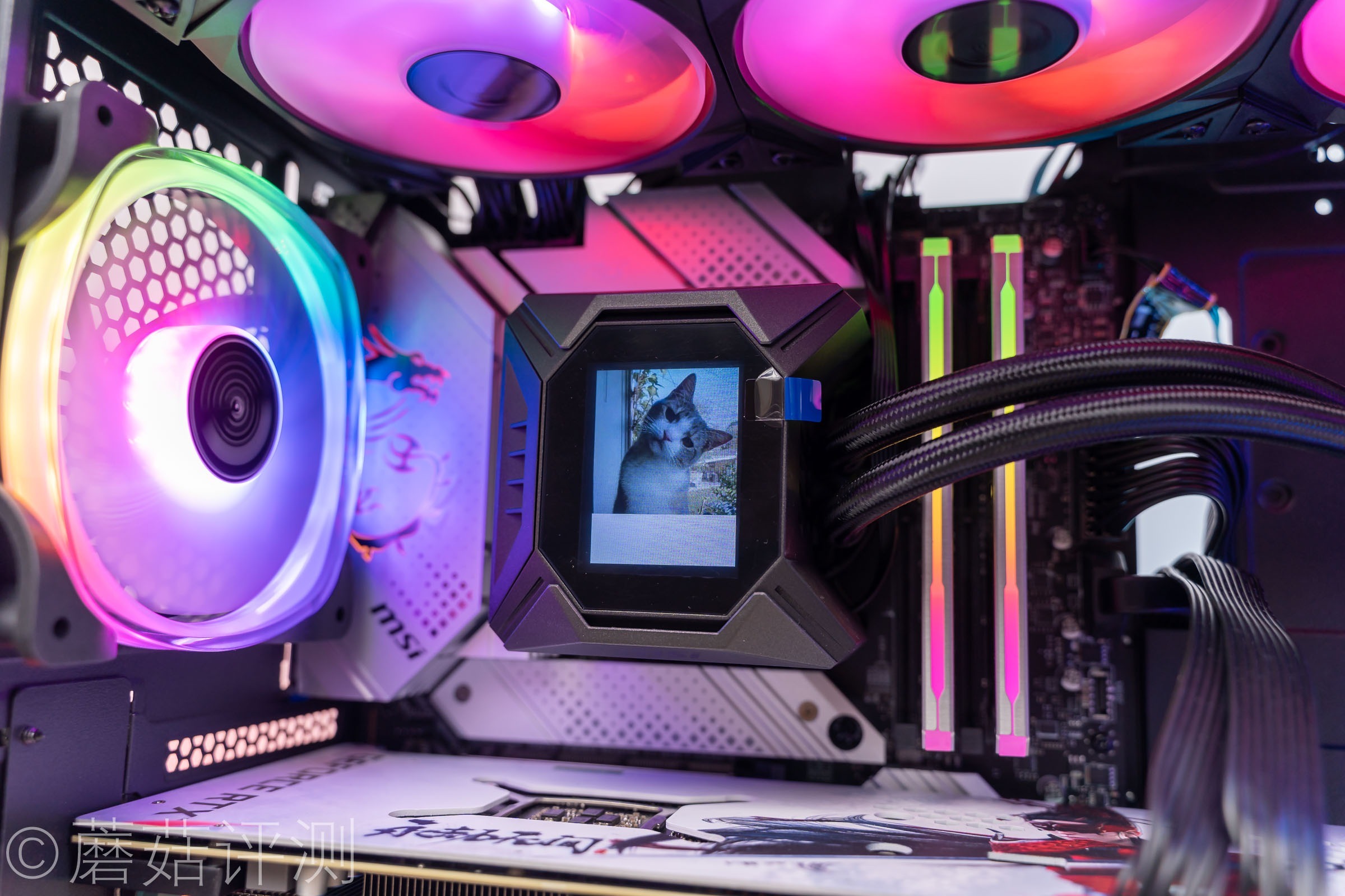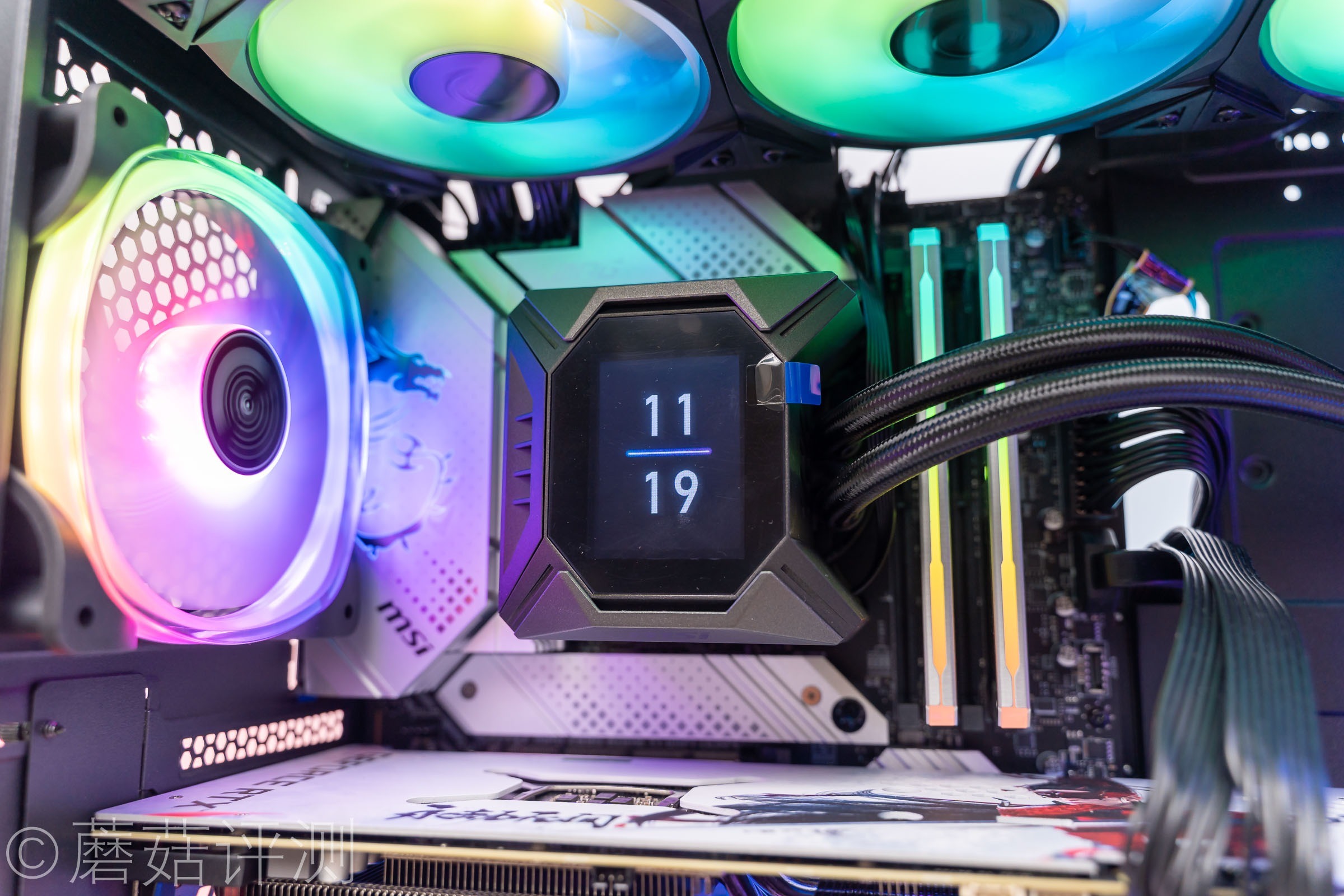 ▼微星这款寒霜K360水冷的颜值还是非常漂亮的,水冷头上有一块屏幕,水冷排风扇支持幻彩ARGB灯效。