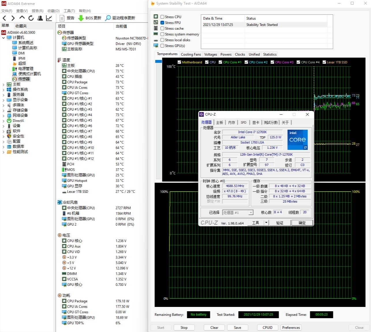▼单烤FPU,处理器功耗180W左右,自动睿频4.7GHz,处理器温度73℃,核心温度在65℃左右上下波动,整体表现不错。