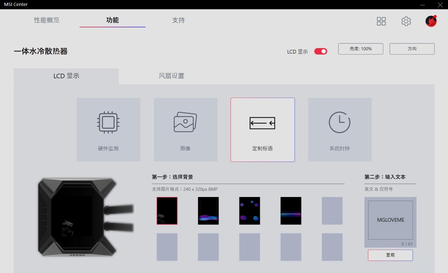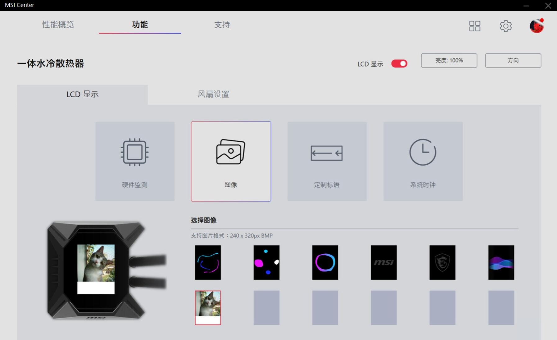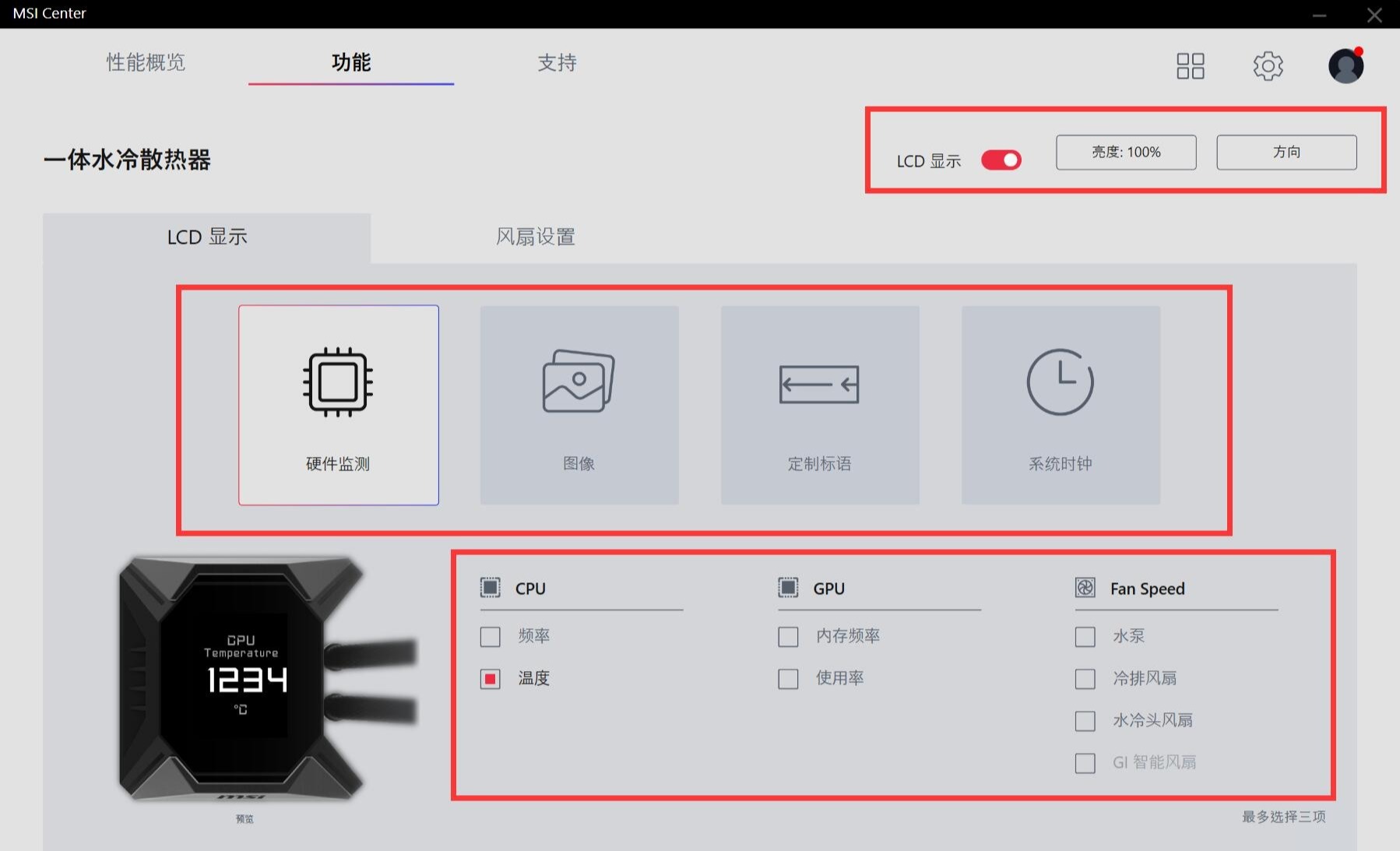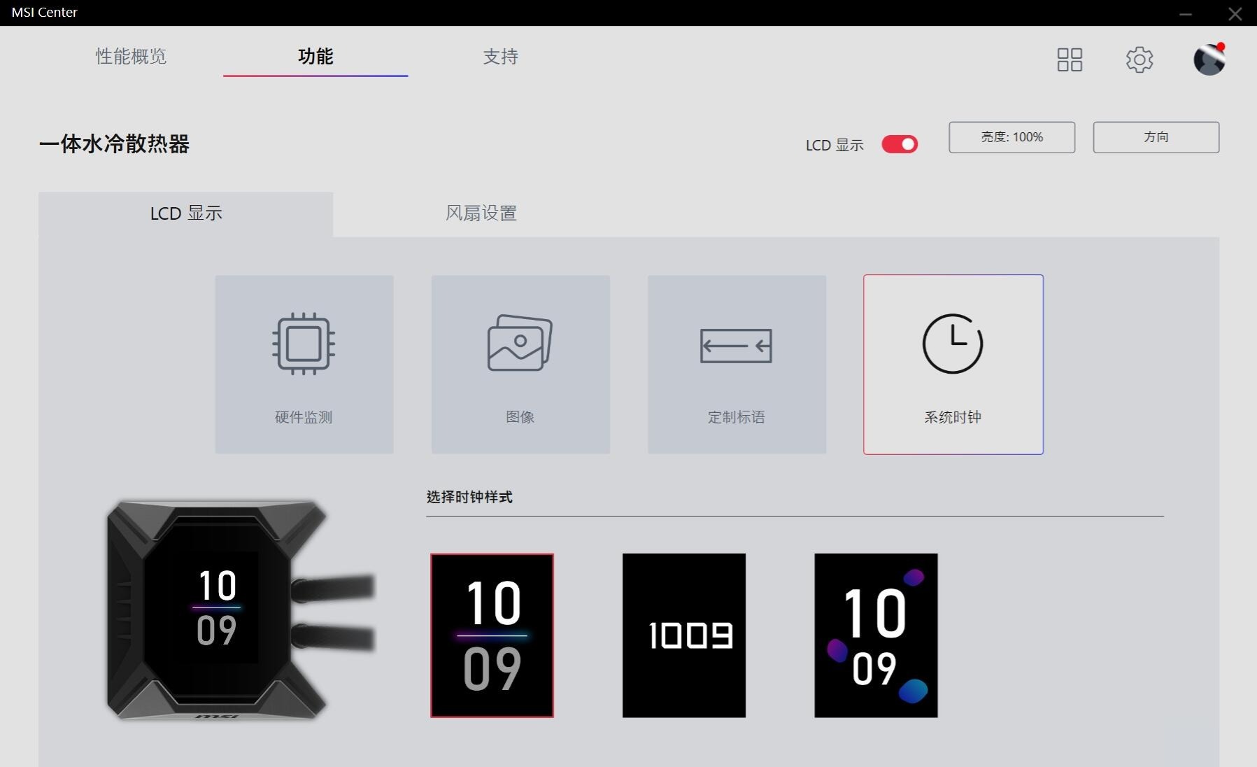 ▼微星将自家的各种软件都整合进了MSI Center里面,日常的安装使用还是挺方便的。水冷的控制界面非常简单,右上角设置屏幕亮度和方向,中间设置屏幕的四个显示模式,底部设置四个显示模式的具体显示内容。