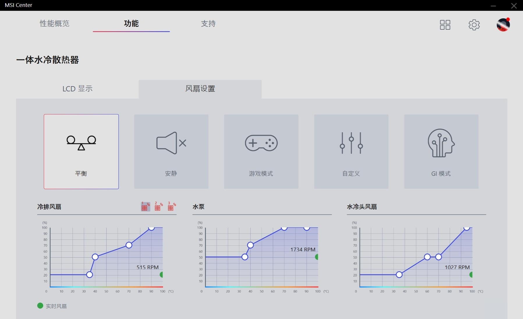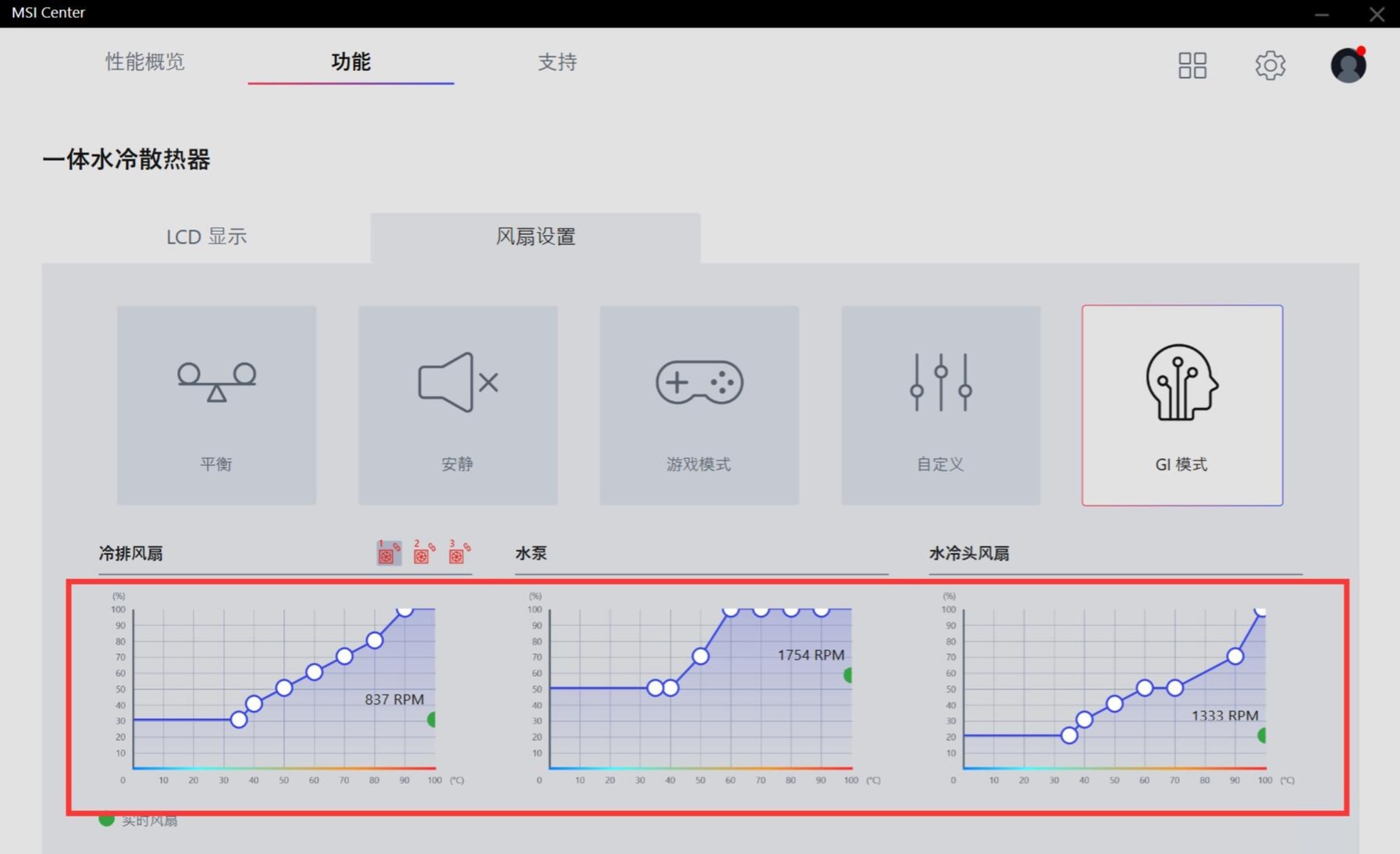 可玩性方面,这款水冷的水泵转速、水泵风扇转速、冷排风扇转速,且是每一把冷排风扇的转速,均支持自定义调节,且是那种画曲线的自定义调节,调速简单不说,可以自定义的发挥空间还非常大,不错不错。