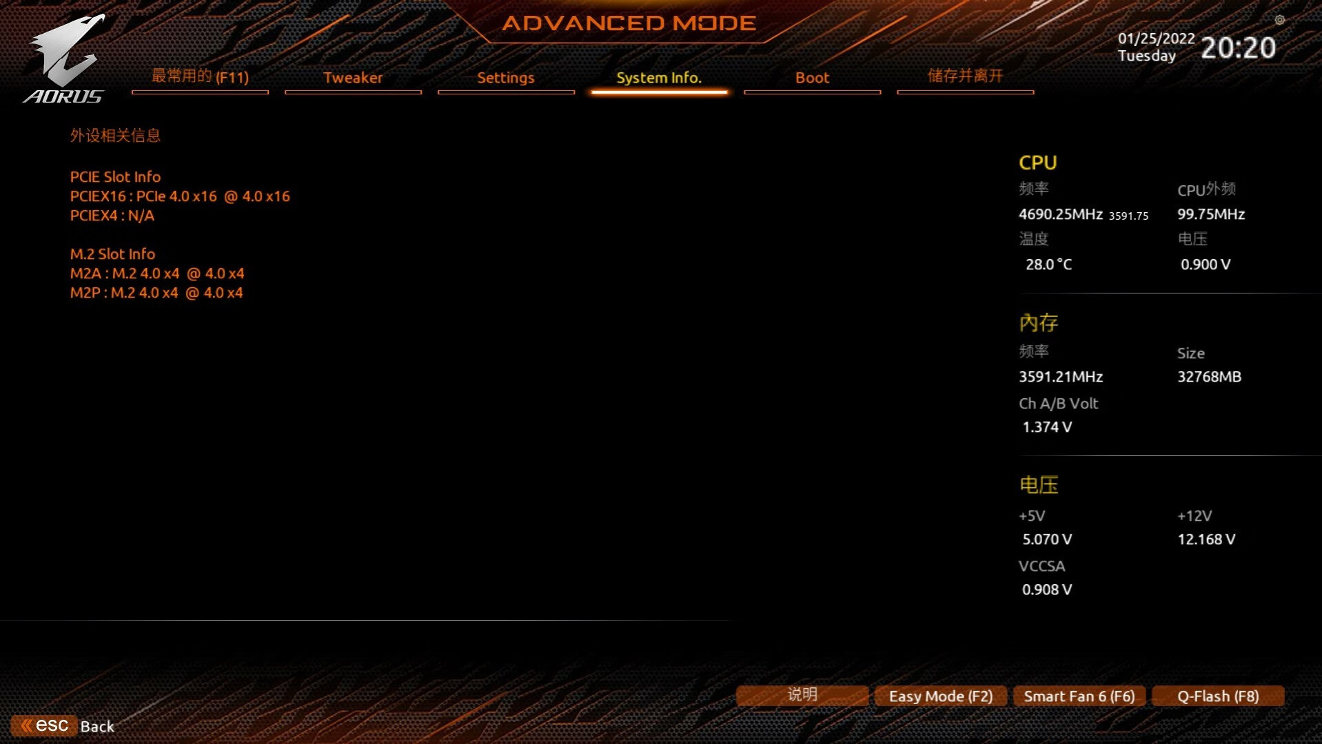 ▼技嘉的BIOS还是挺不错的,整体的结构直观,逻辑清晰,稍微了解一下就会非常好用。默认的Easy Mode,各种参数、接口介绍的很清楚,内存的XMP也可以轻松开启。