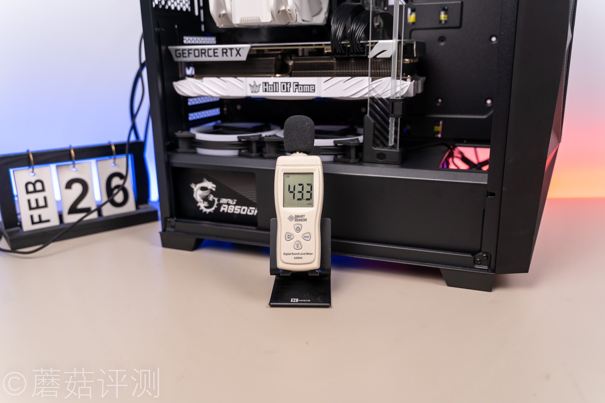 ▼开机,拔掉所有的其他风扇,散热器默认转动的情况下,整体的噪音表现在43.8dBA。待机情况下,这款散热器超级安静,两把风扇,几乎没有什么噪音发出。