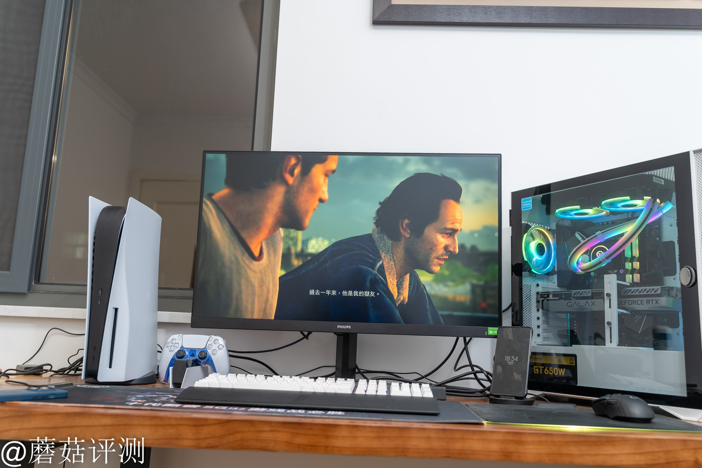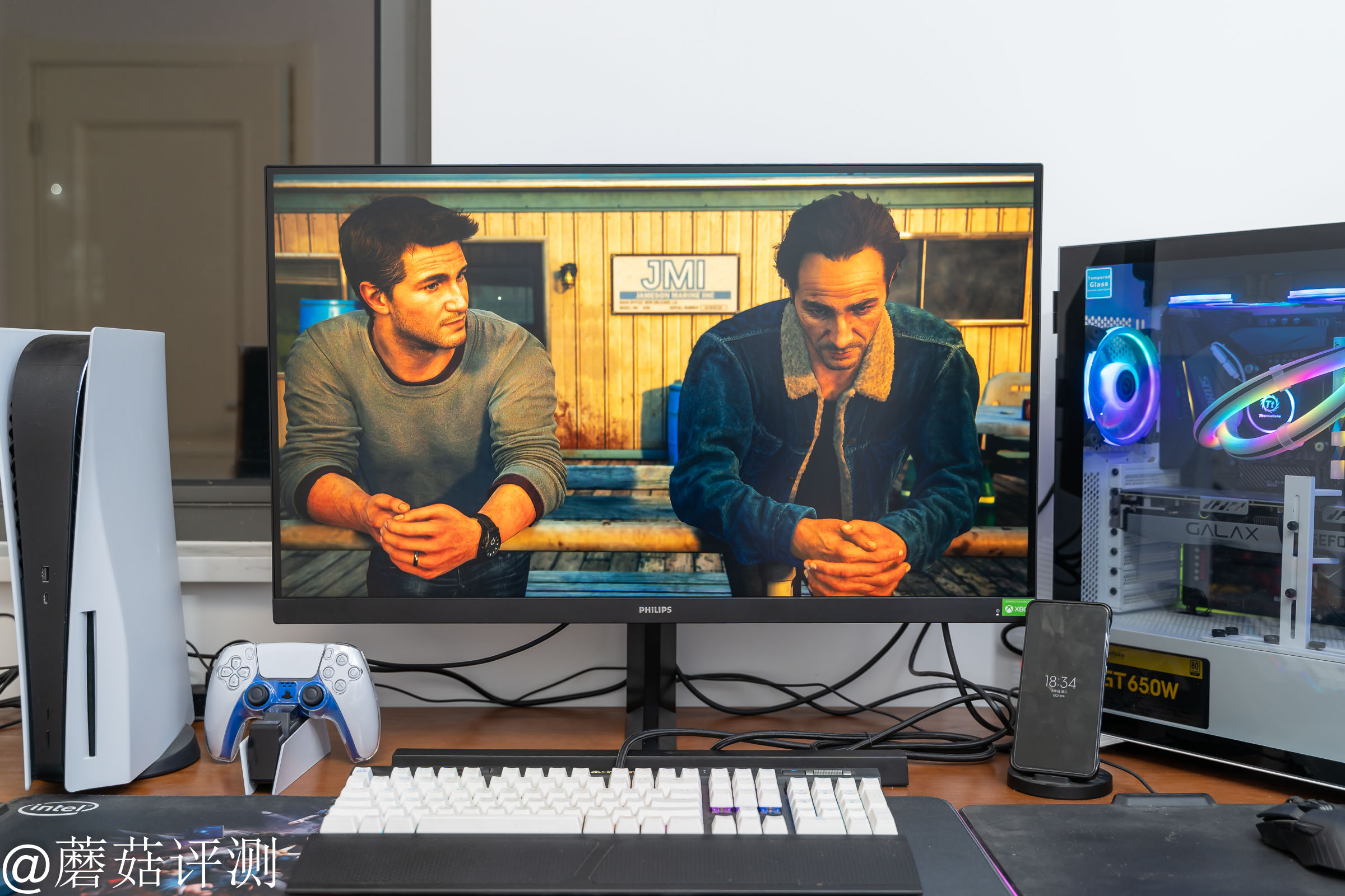 ▼右侧放置原来的主机,左侧是心爱的PS5,这两台设备都通过中间这一台显示器输出画面,整体的使用体验还是非常棒的。显示器中的游戏画面就是神秘海域的主角和他的哥哥,朋友已经迫不及待的玩上了。