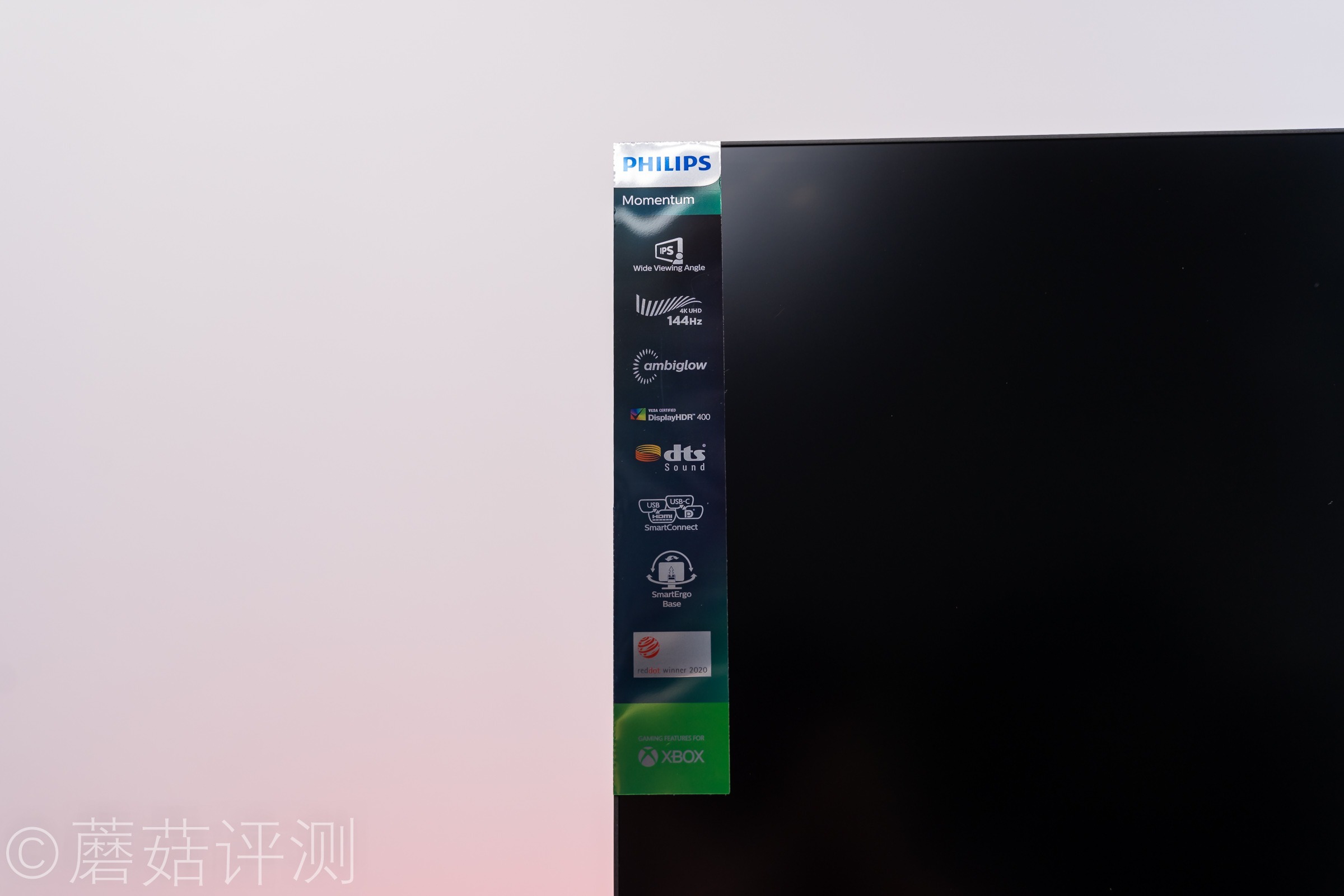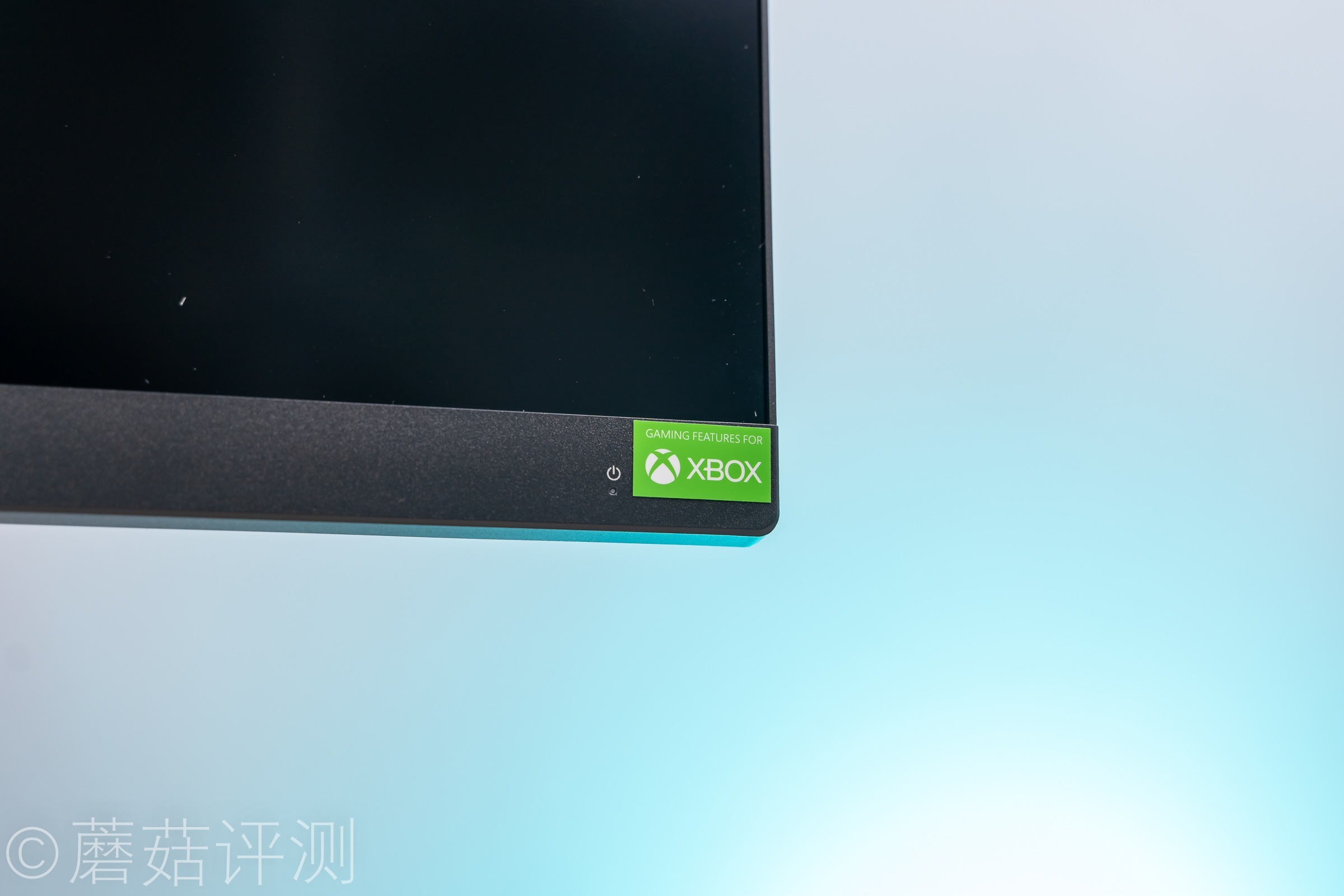 ▼显示器的右下角是电源指示灯,旁边有一个硕大的、绿色的XBOX的LOGO,说明这款显示器有针对PS5、XBOX这种游戏主机进行专门的适配和优化。