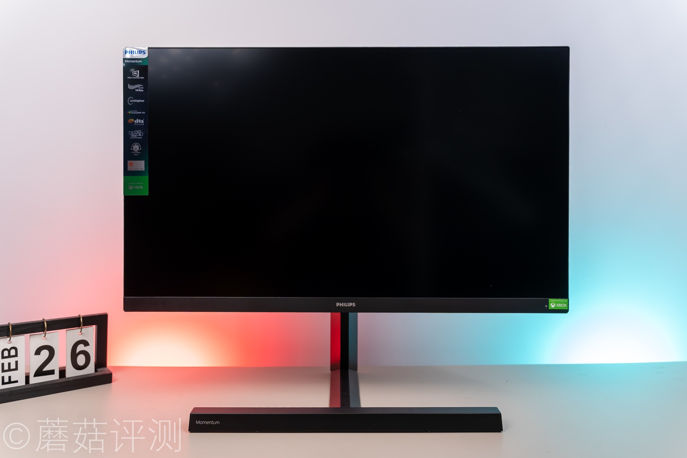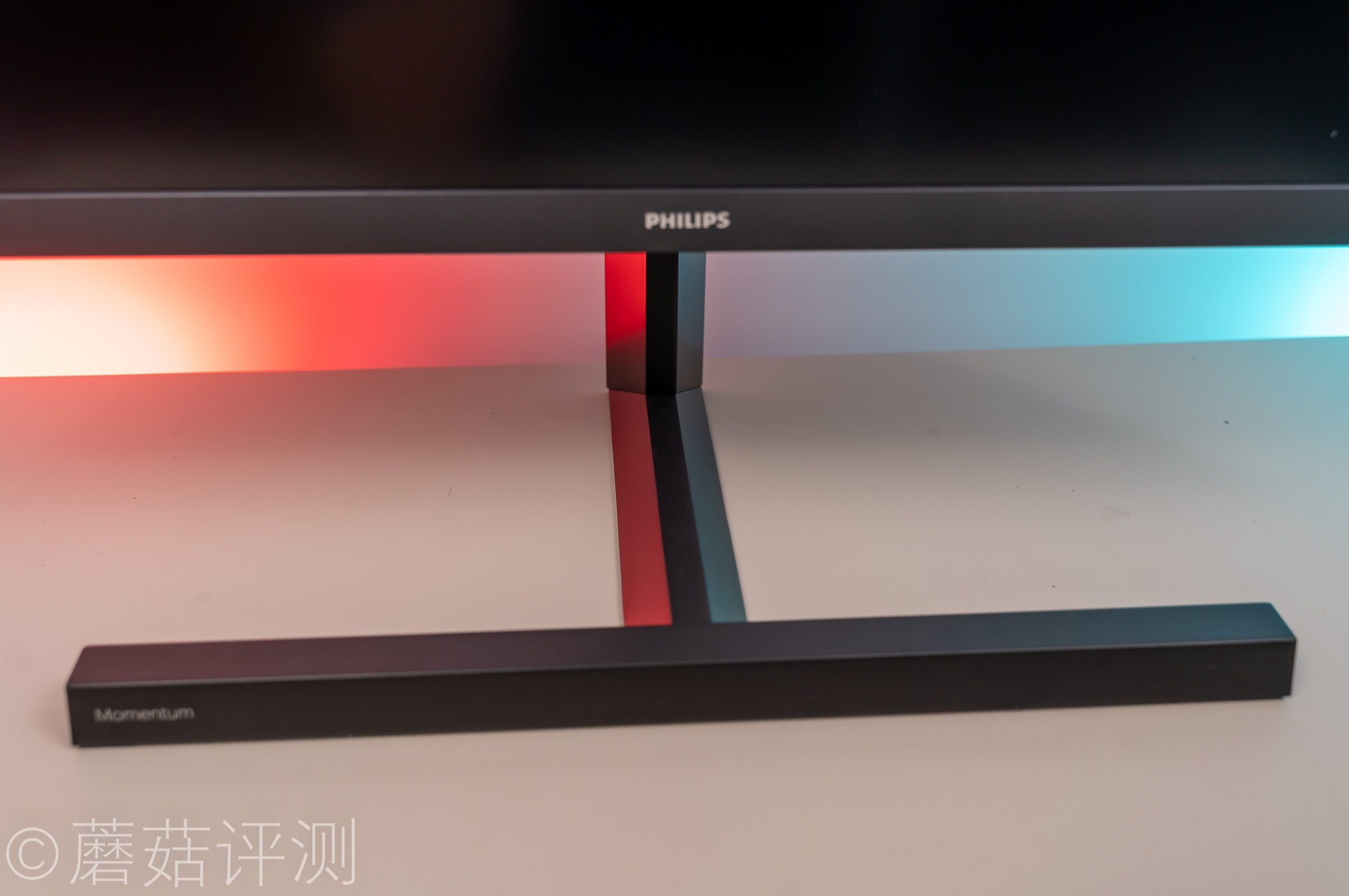 ▼显示器的支架采用全金属设计,表面有细腻的喷砂处理,质感出众。底座的左侧有Momentum的字样,这是飞利浦的高端产品系列名称。