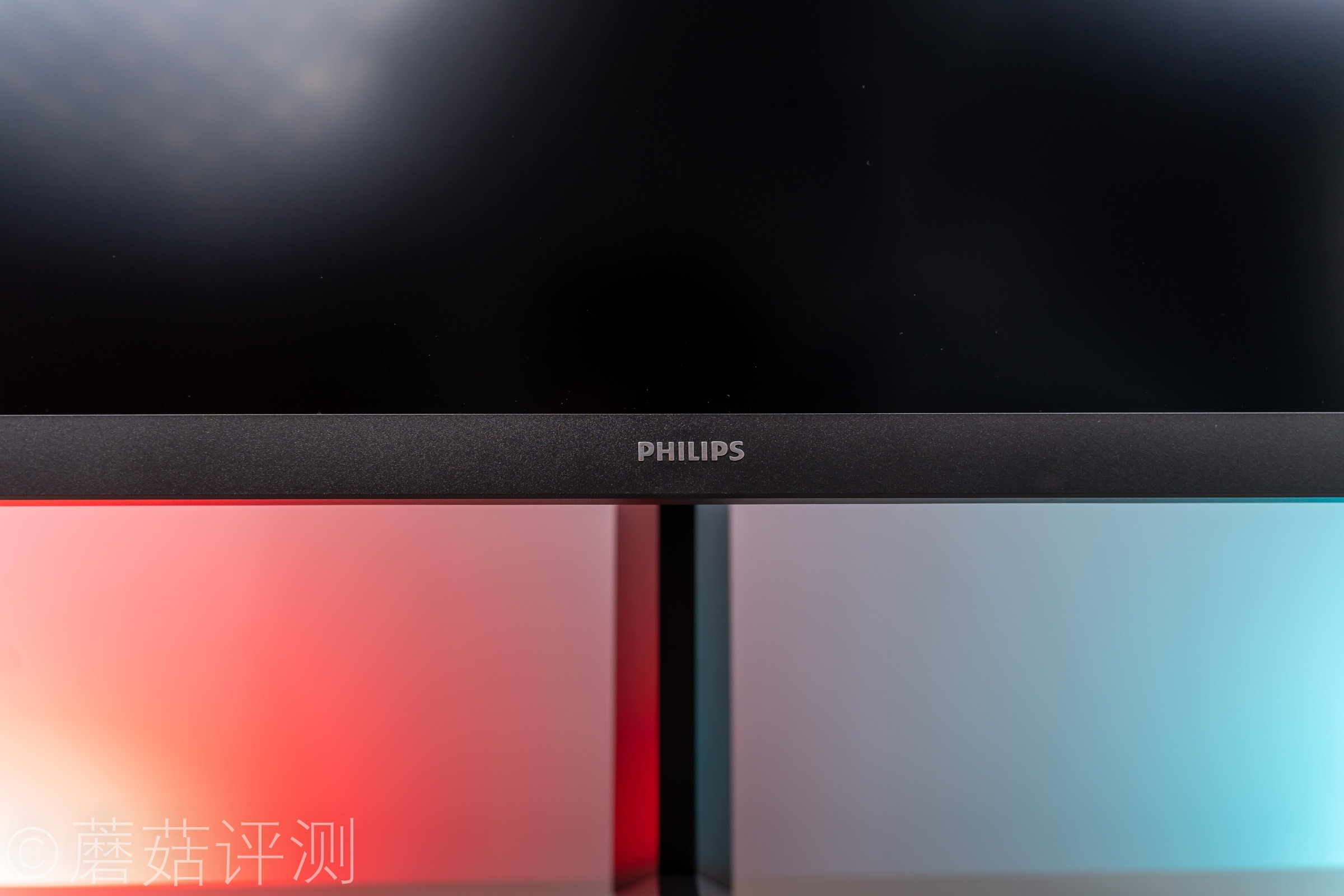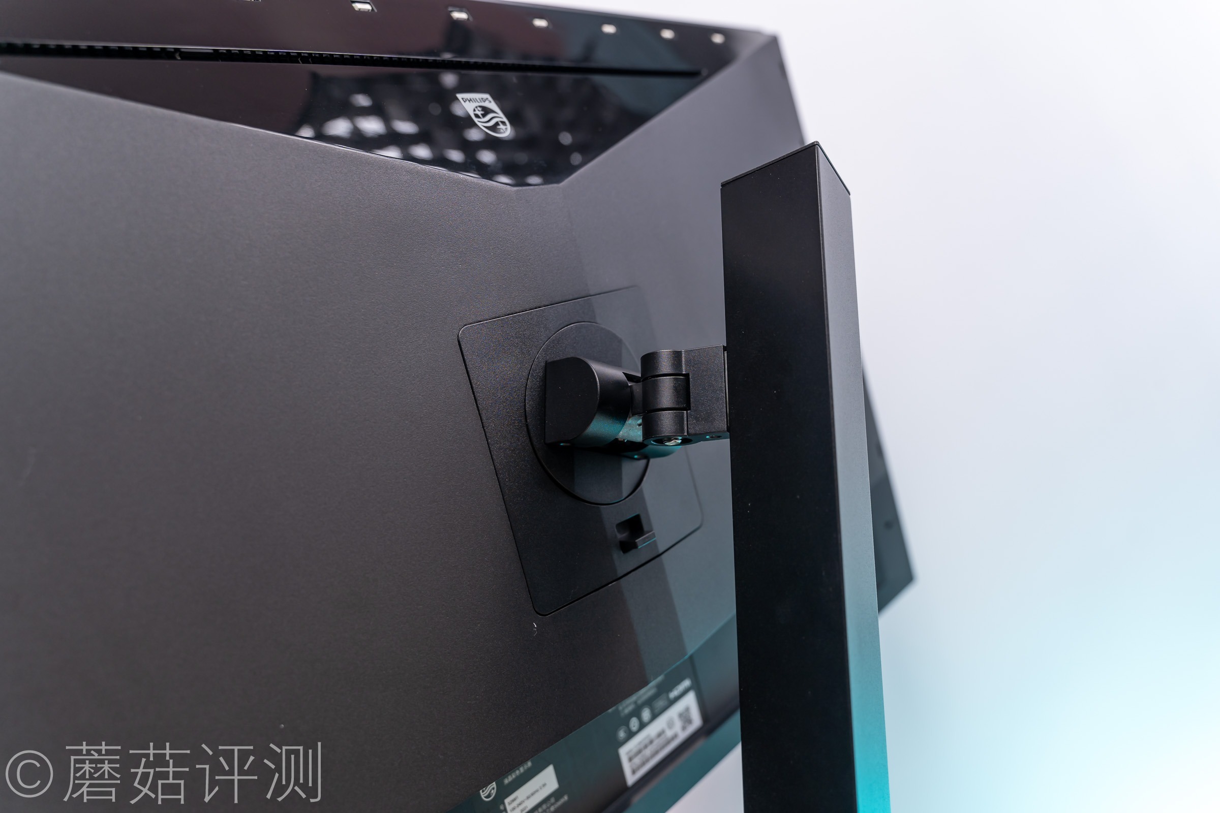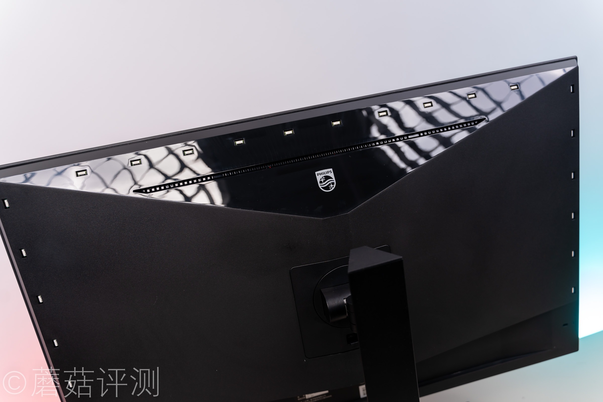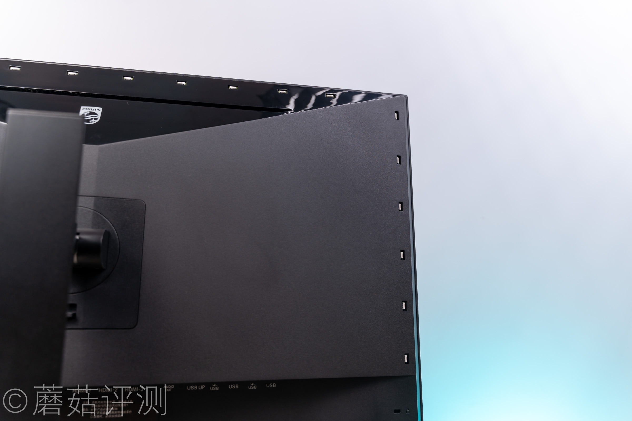 ▼显示器顶部有一块区域使用了镜面设计,中间有熟悉的飞利浦的LOGO。上侧是一条散热格珊,方便显示器内部的高温空气上升,带动气流,辅助显示器内部的其他硬件散热。