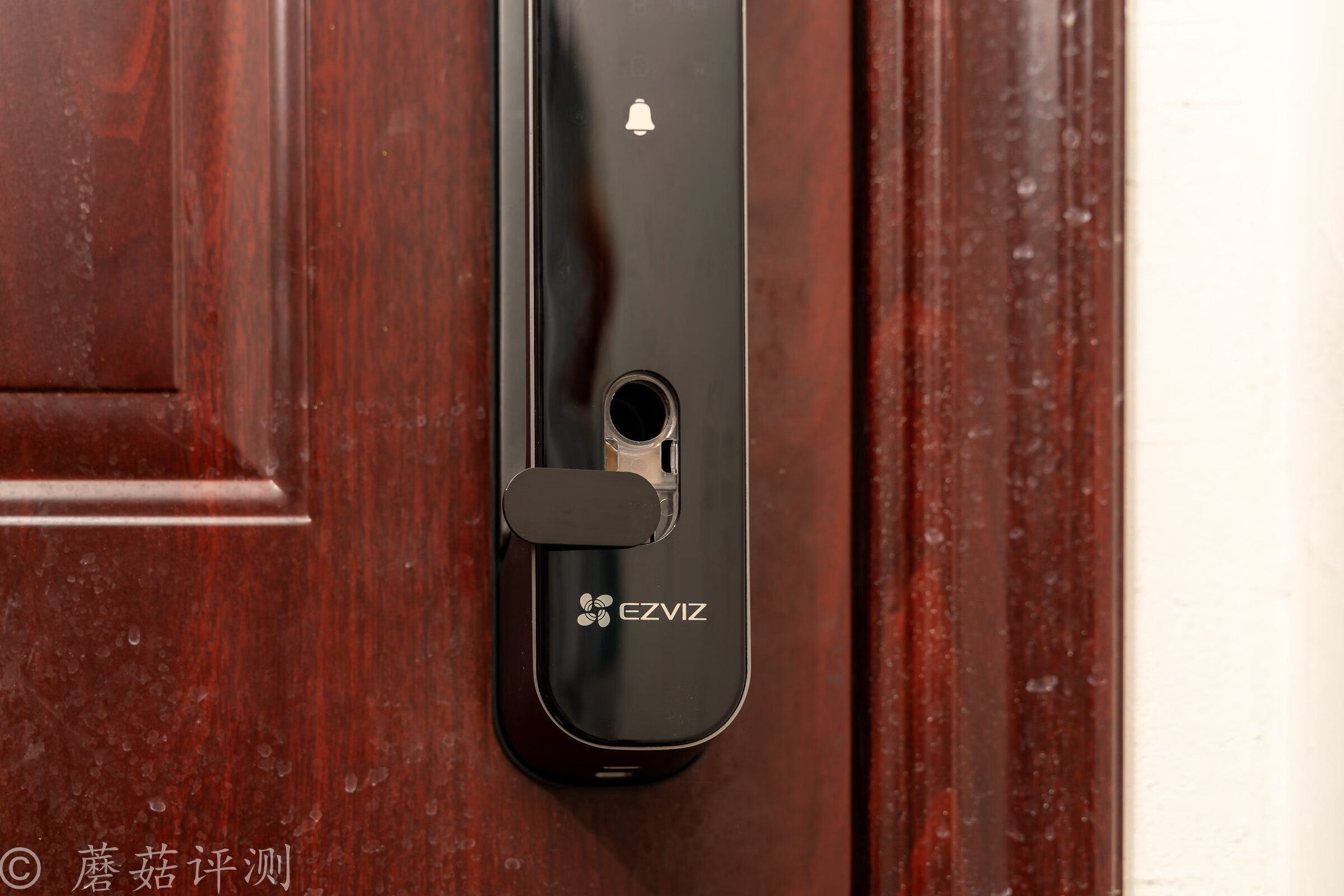 ▼底部是萤石的LOGO和锁孔,另外,门锁的最下面还有一个Type-C接口,用于紧急供电。