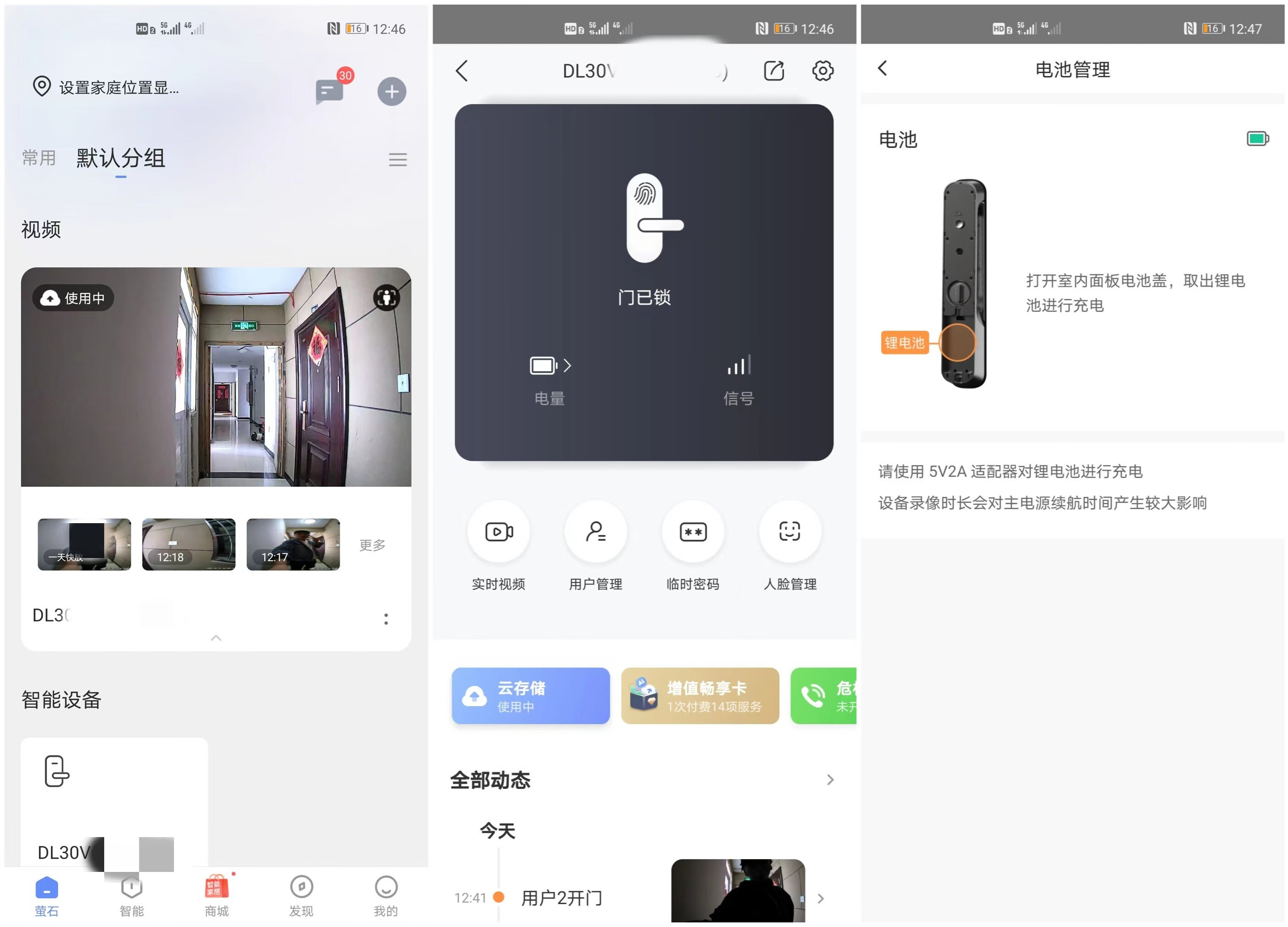 ▼萤石DL30V智能视频锁安装好之后,可以绑定萤石云视频APP,通过APP,可以对门锁的一些状态进行远程监控,例如门锁的电池电量之类的。在门锁电量低的情况下,APP也会提示用户充电。