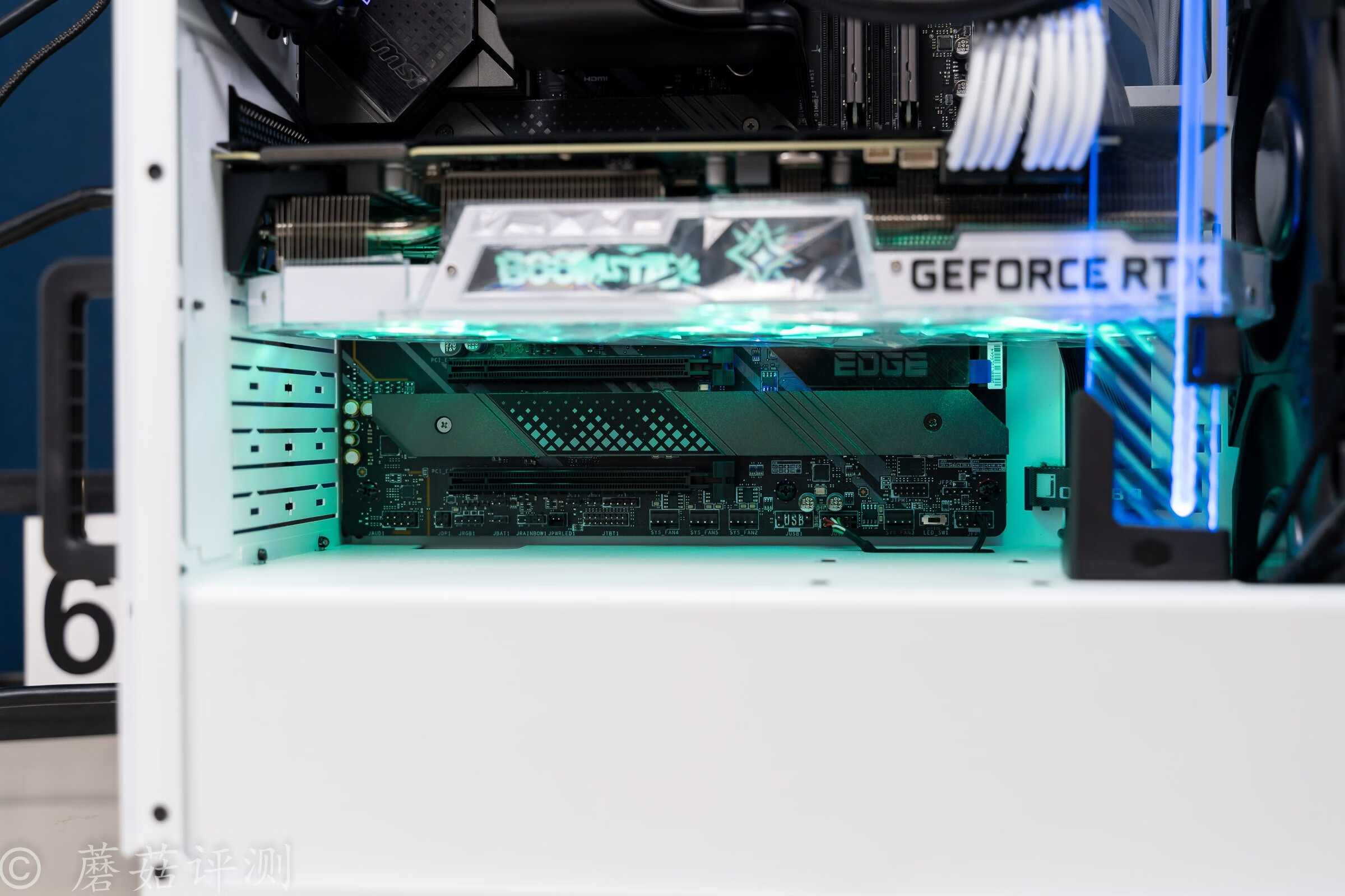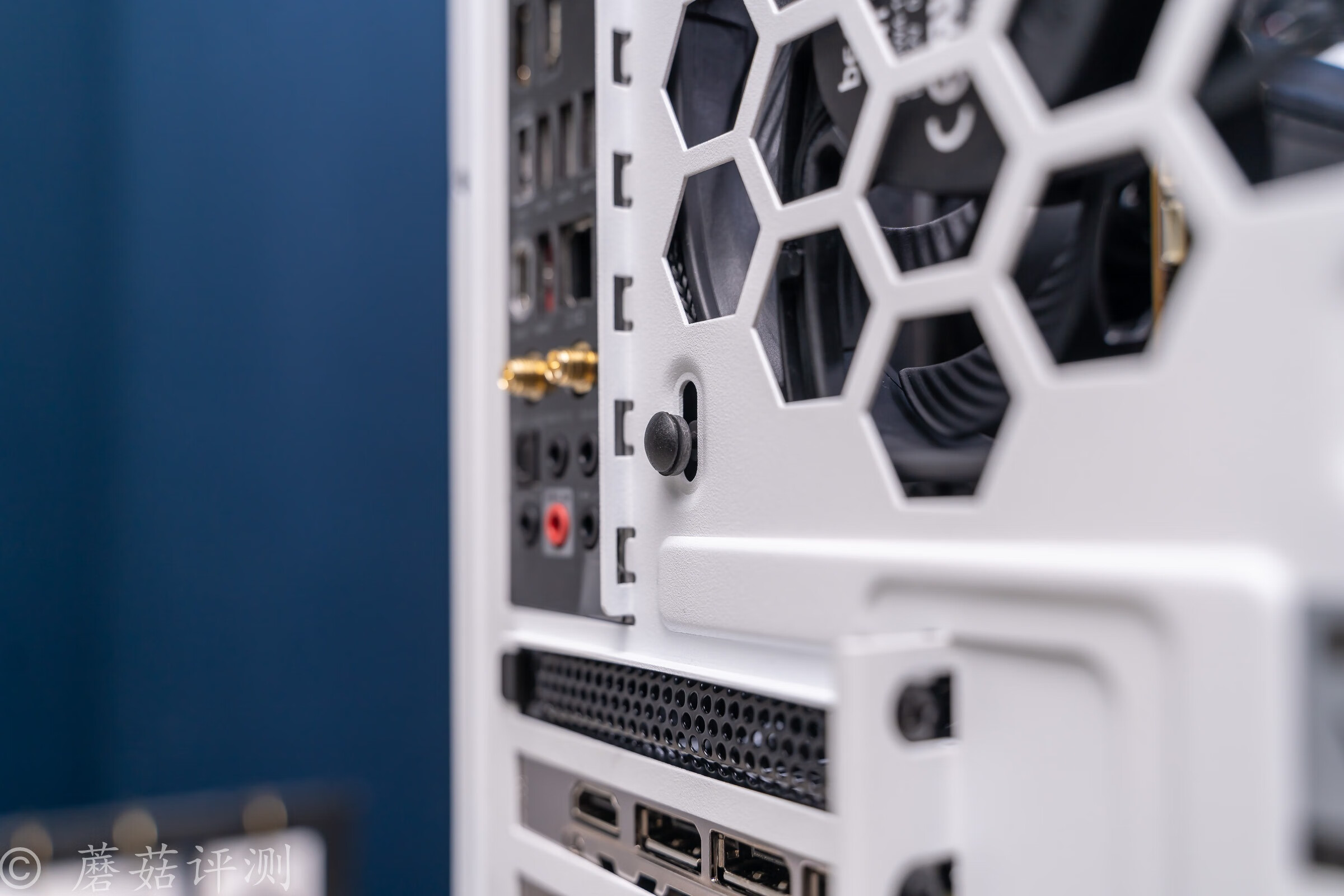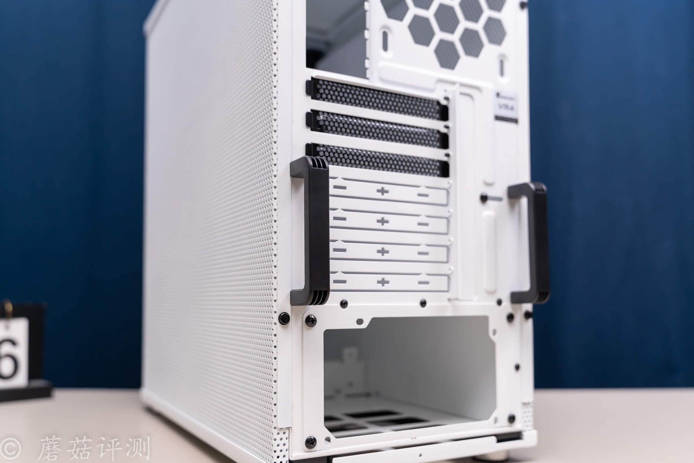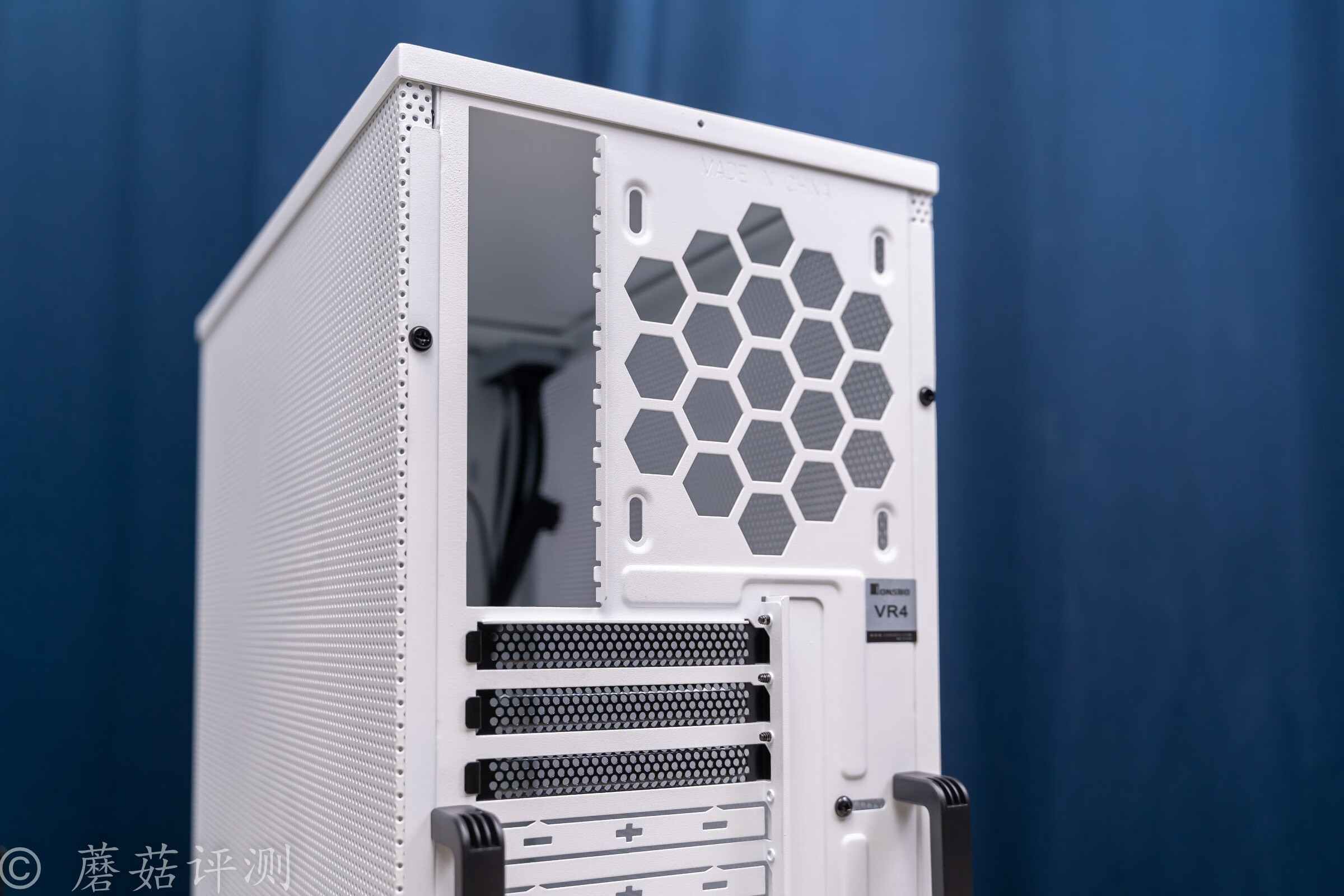 ▼靠近看看,主板IO开口非常靠上,右侧是机箱风扇的固定位。IO开口的下方,有4条PCIe插槽,其中三条是黑色可拆卸式金属挡板,白色的一次性金属挡板。