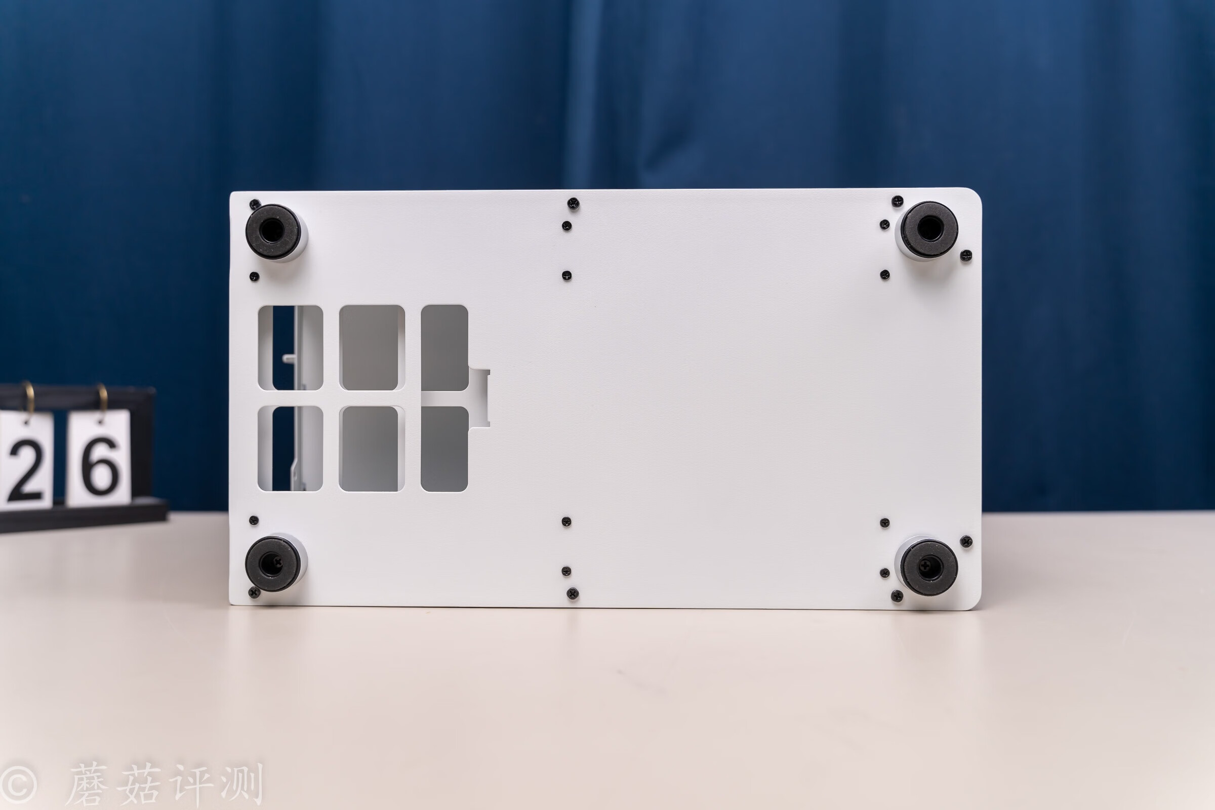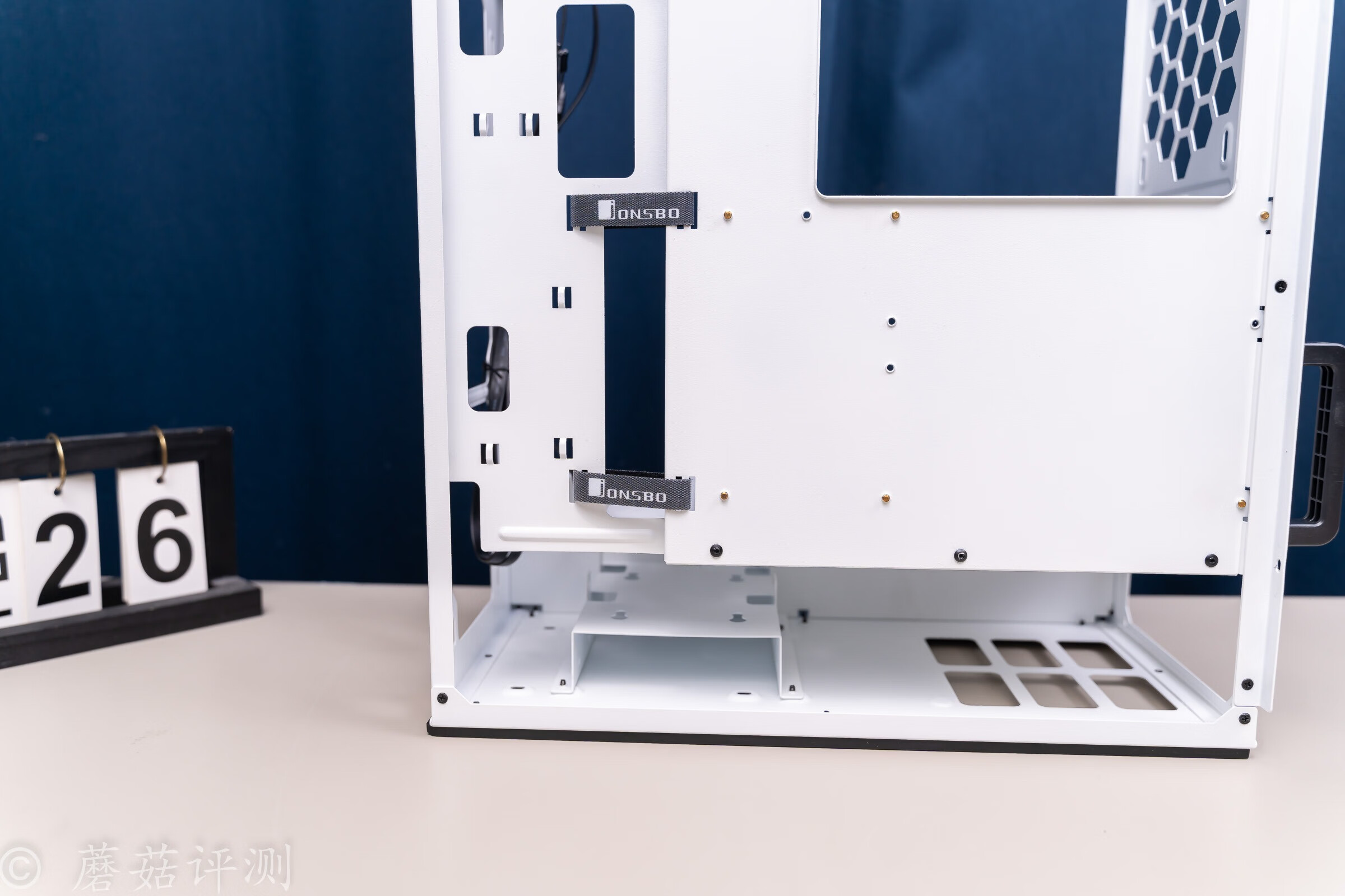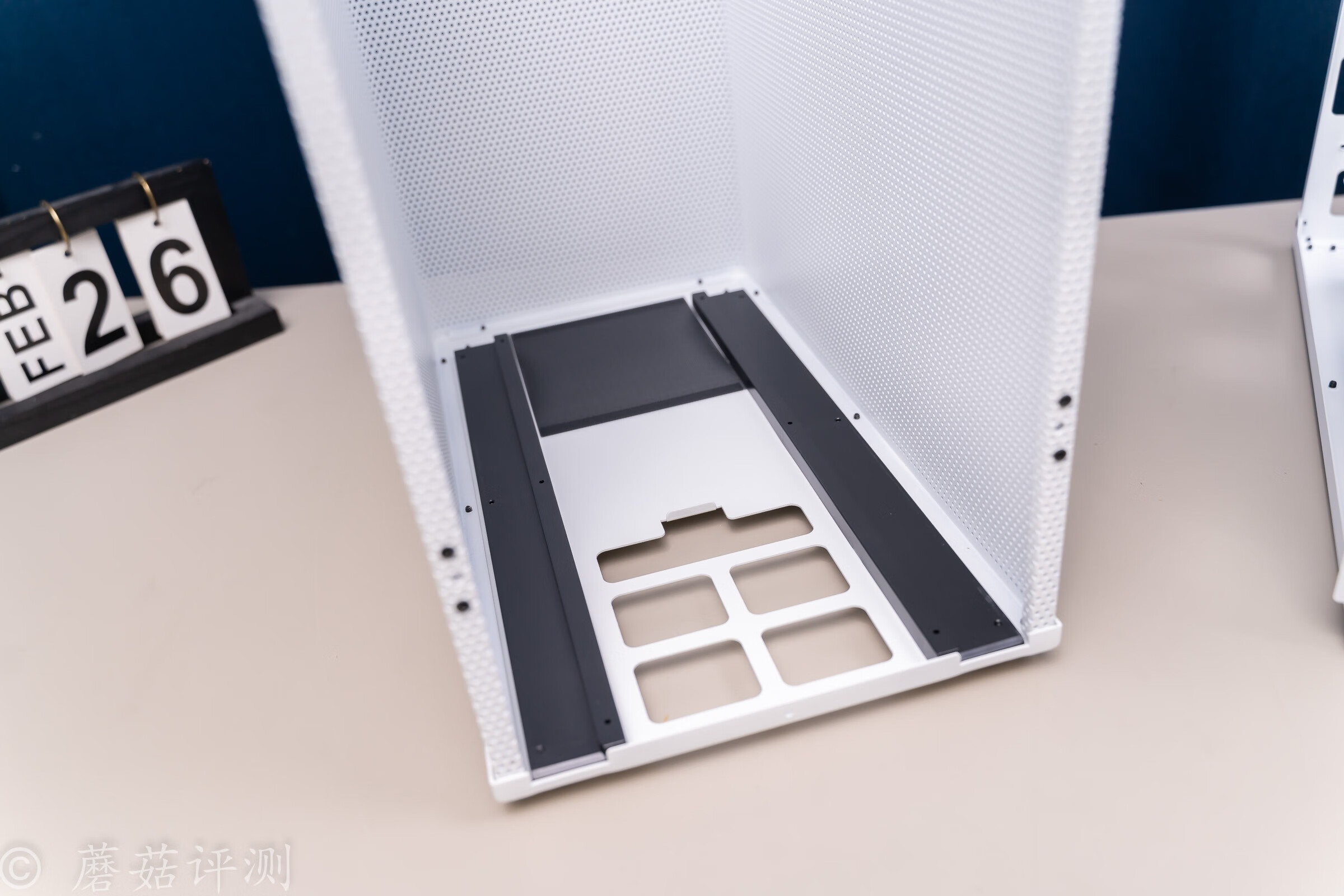 ▼机箱底部的两侧有滑道,方便推拉机箱内部的框架。电源出风口部分的磁吸金属防尘网,自己移动到机箱的内侧了。