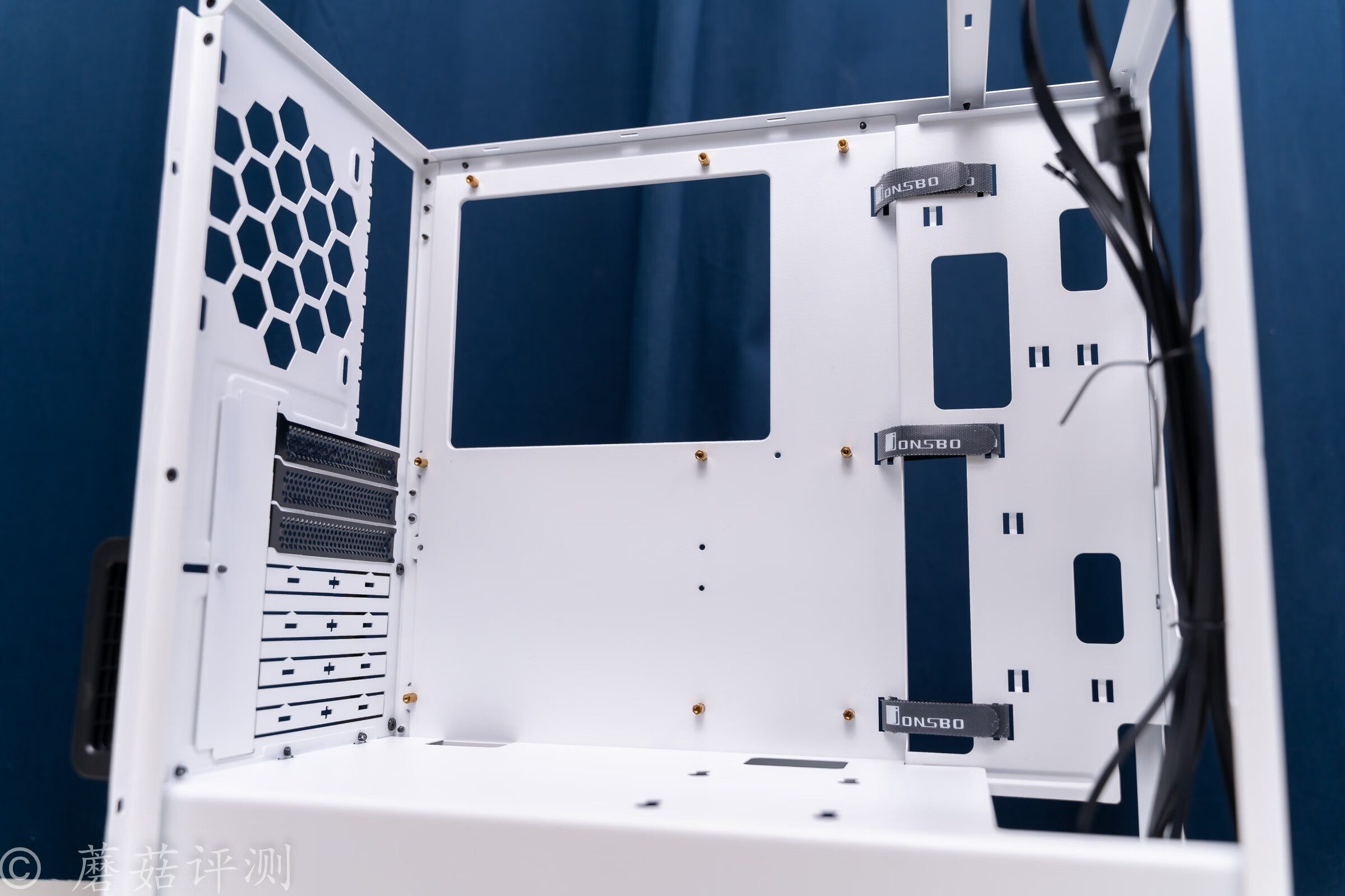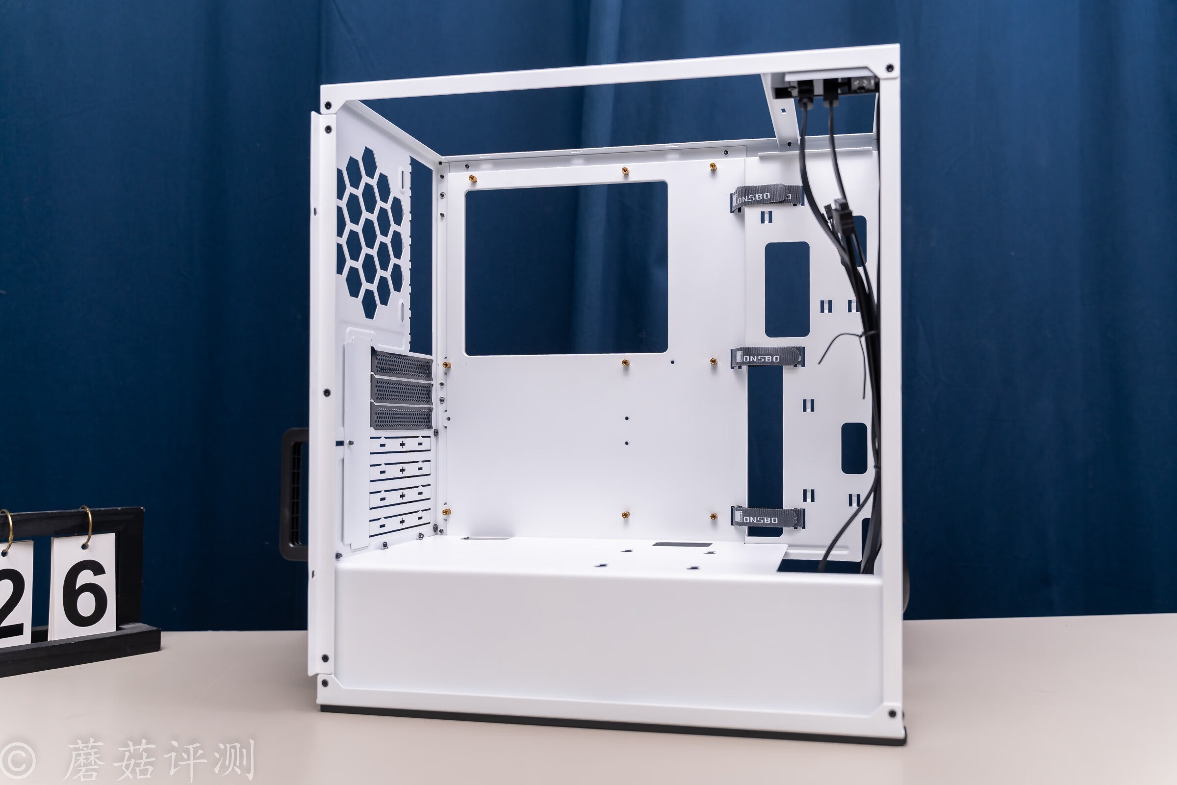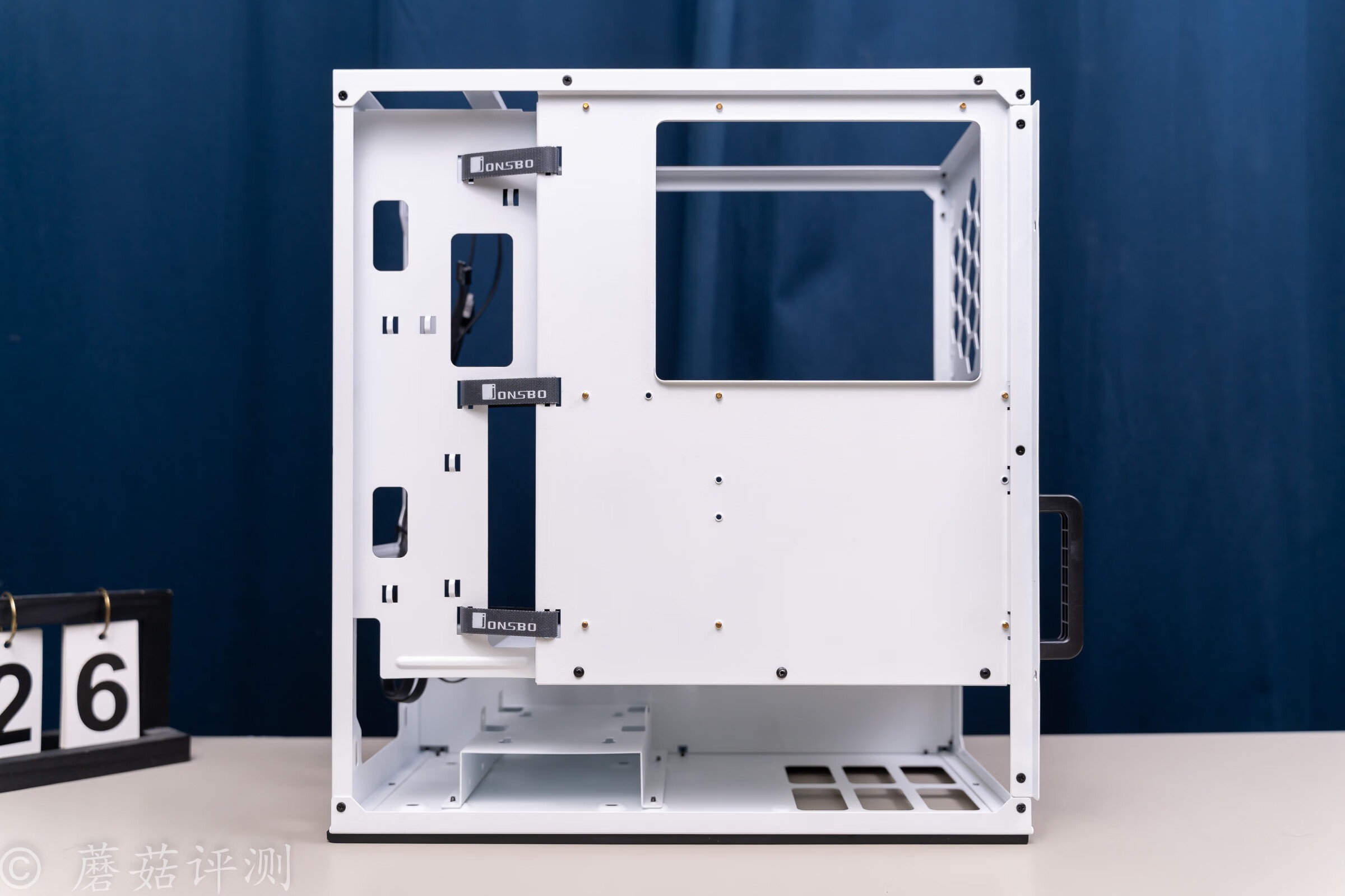 ▼机箱的左侧用于固定主板,左侧和底部有用于走线的开口。