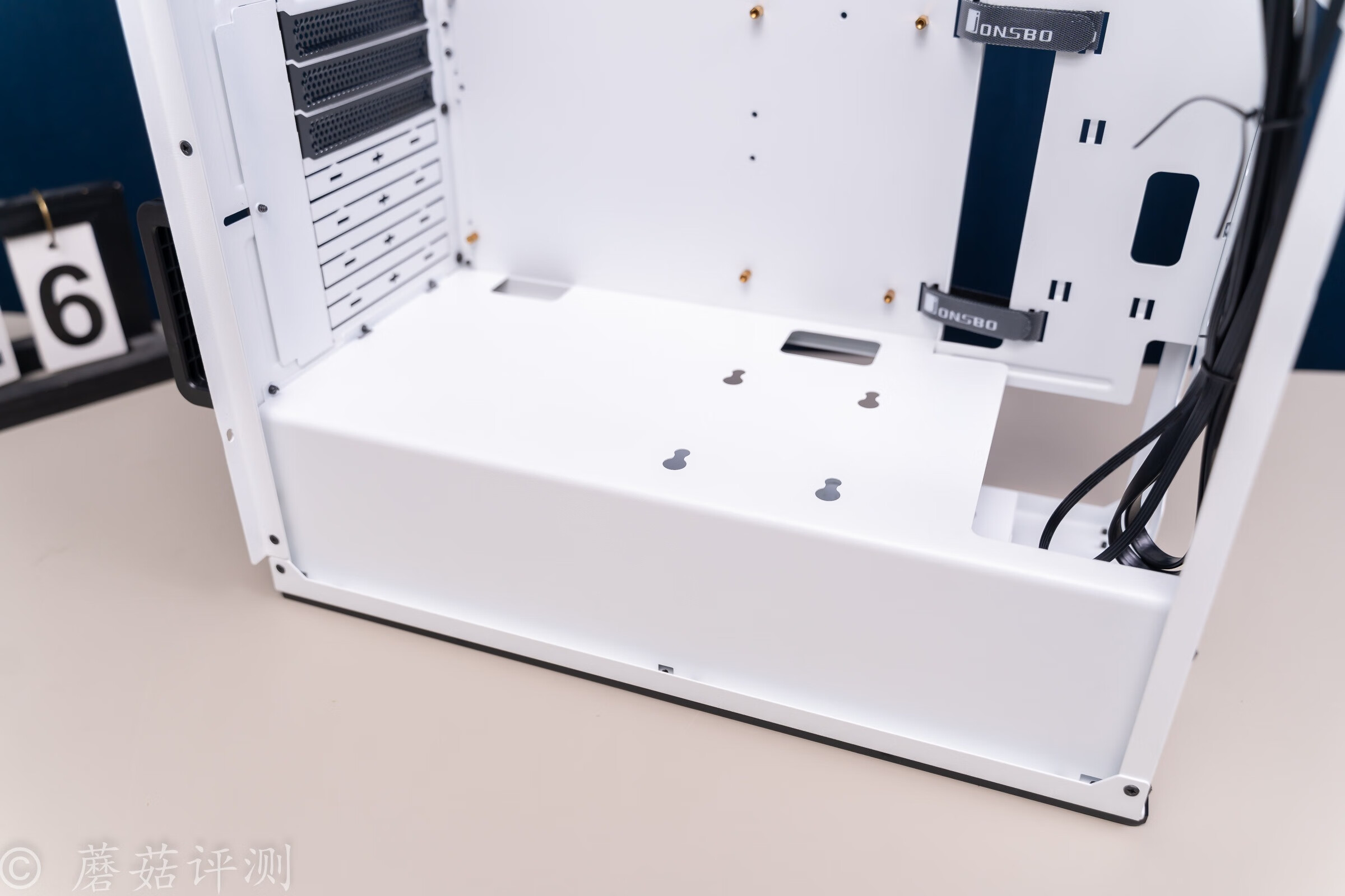 ▼机箱底部的独立电源仓,右侧有硬盘固定位,支持快拆的。