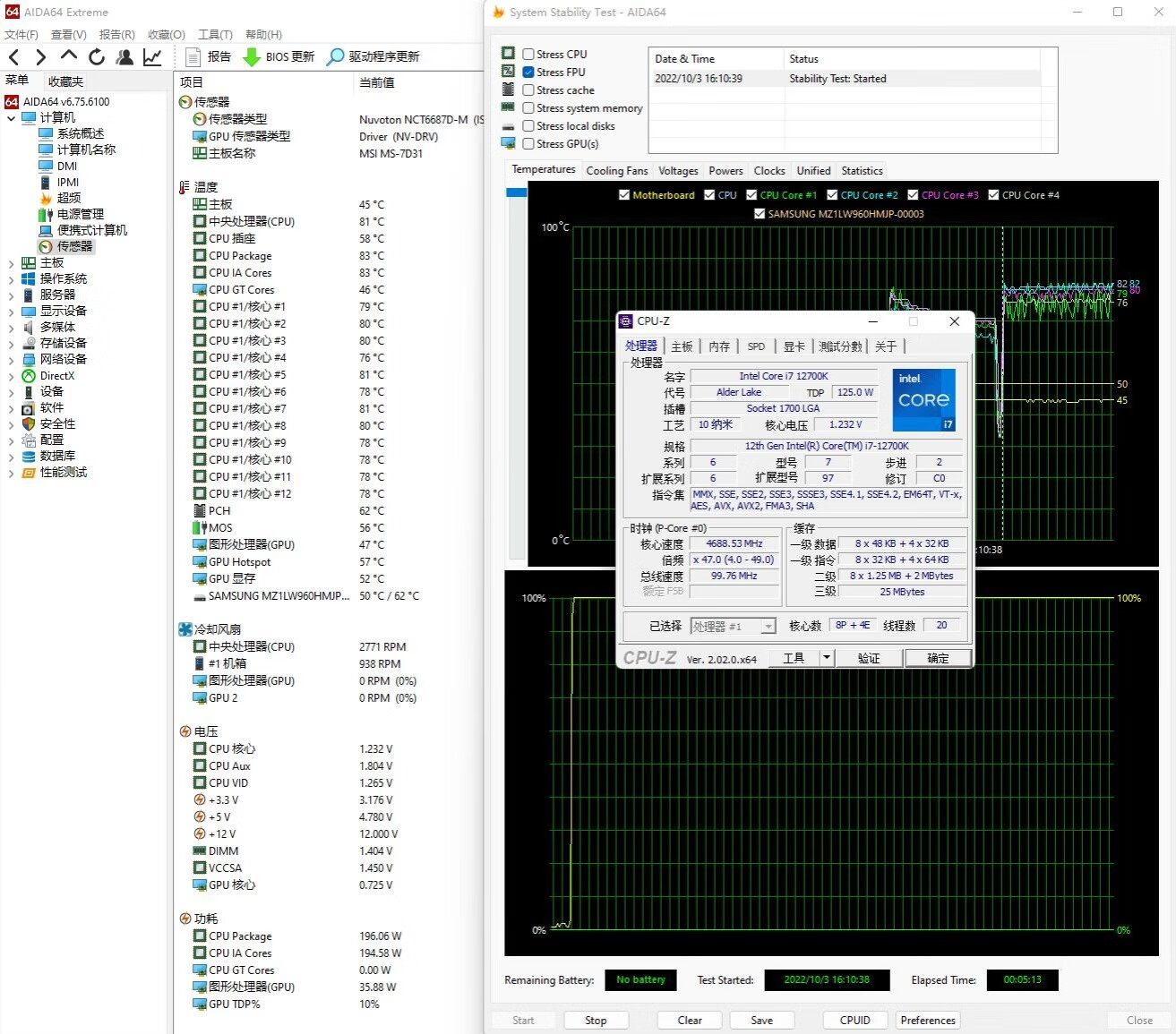 ▼单烤FPU测试,处理器功耗200W左右,温度在81℃左右波动,南桥62℃,显卡47℃,固态50℃。处理器的温度保持一条直线,稳定在81℃左右,机箱内部的空气已经流动起来了。