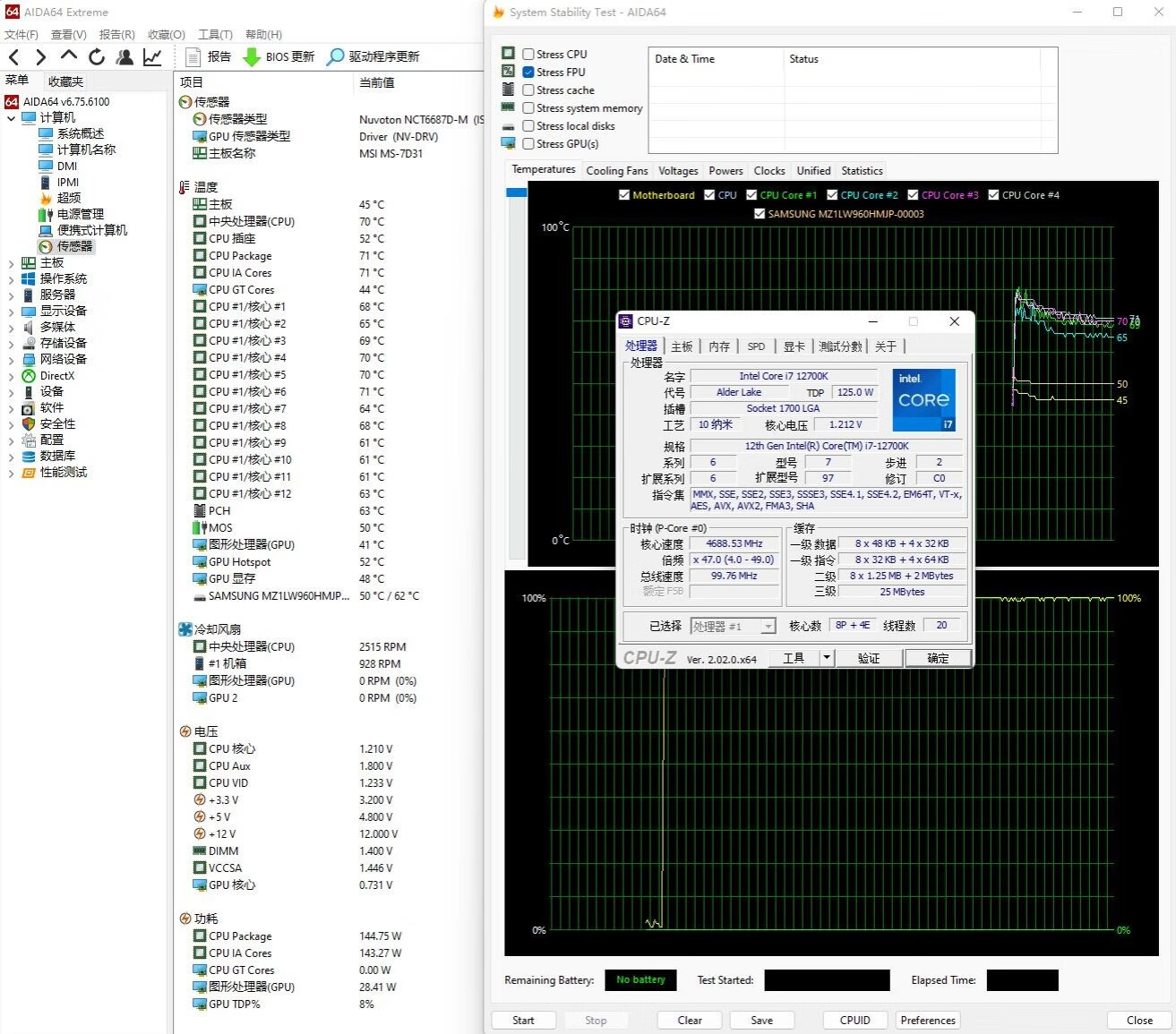 ▼简单跑个CPU的压力测试,处理器功耗145W左右,温度在70℃左右,南桥63℃,显卡41℃,固态50℃。处理器的温度有一个明显下降的曲线,说明刚开始的时候,机箱内部的空气是之前存住的,空气流动之后开始有新鲜的空气流入机箱,然后冷排的进风温度开始慢慢降低,处理器温度也开始慢慢降低。