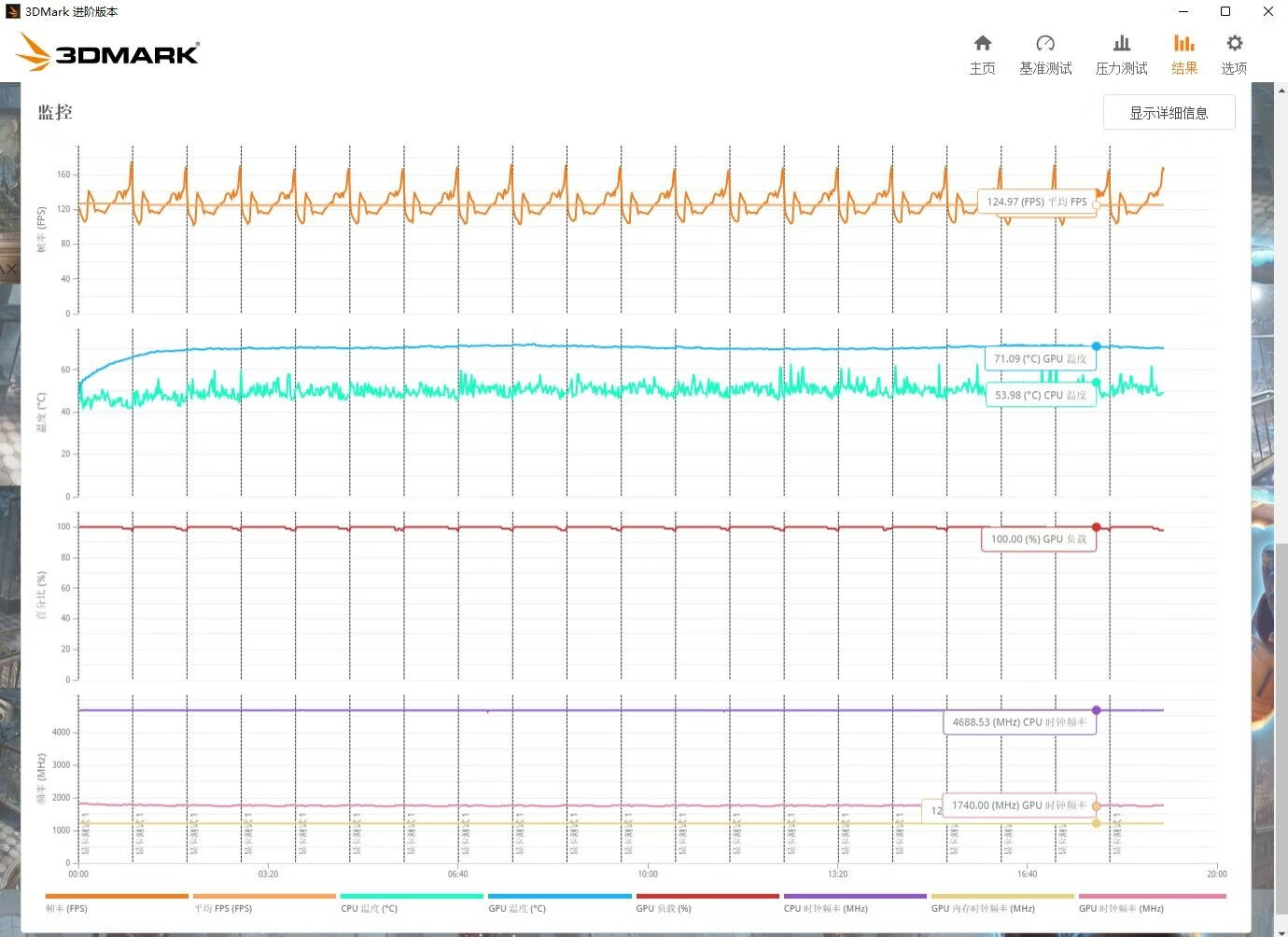 ▼跑个3Dmark的压力测试,帧数稳定率在98.4%,表现还不错。